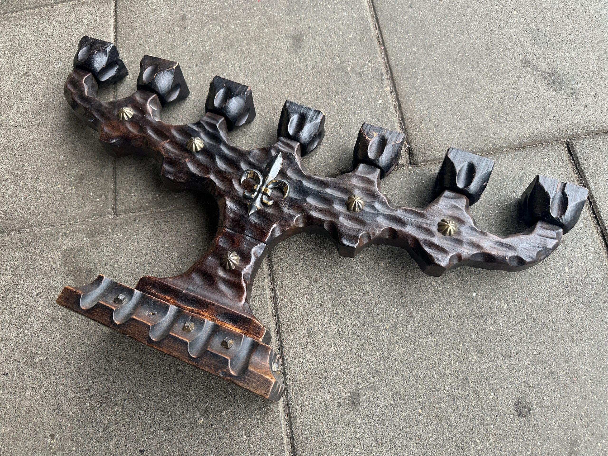 Старая большая деревянная менора, украшенная металлическими элементами и лилией-скаутом.
