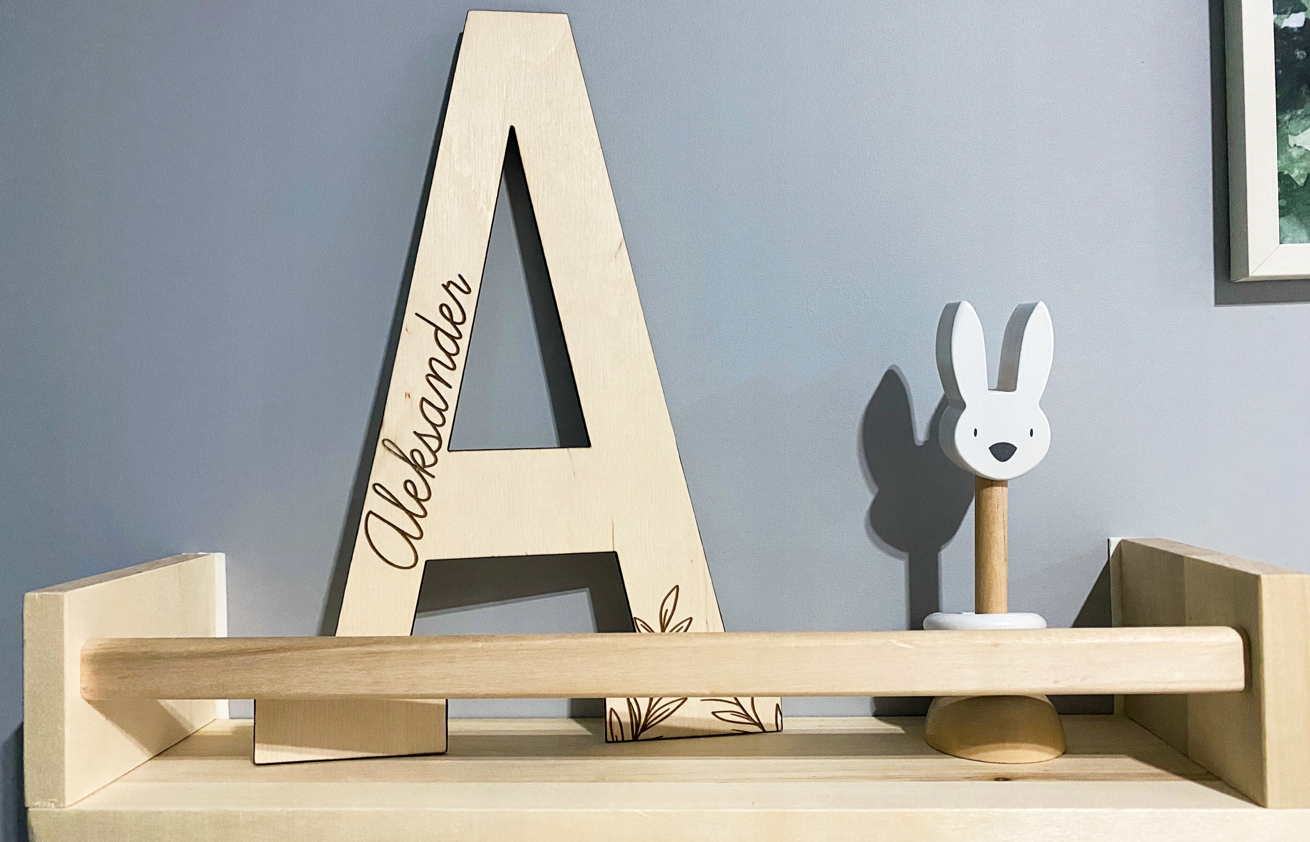 Кроме того, мы представляем формы всех доступных букв. Имя ребенка размещается слева от буквы, обычно вертикально или под углом в случае букв: A,M,W,X,Y,K,S,Z. Пожалуйста, укажите выбранную букву и имя ребенка в сообщении продавцу.