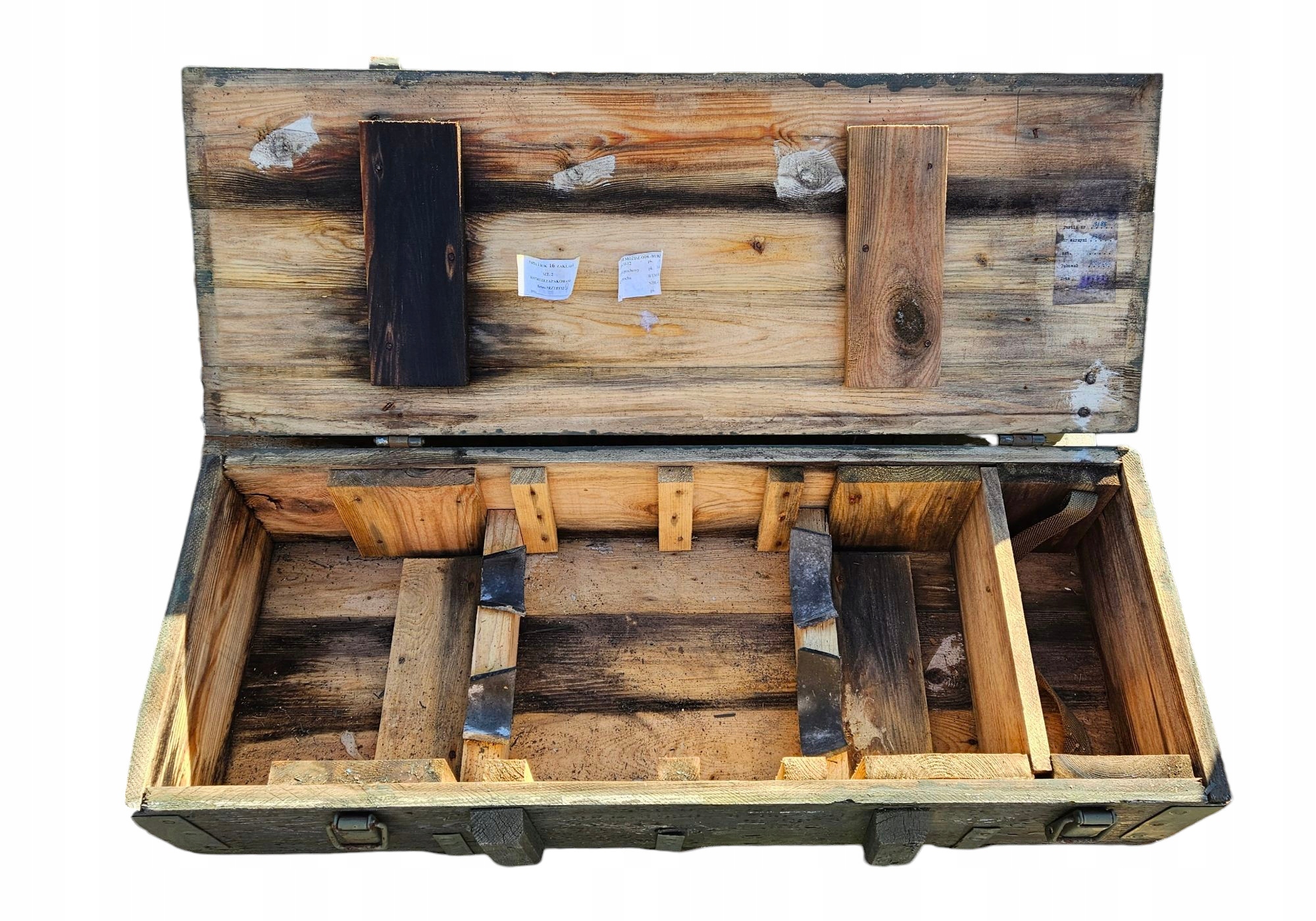 Деревянная военная коробка передач в зеленом растворе. Коробка передач изготовлена, закрыта 2 зажимами, имеет металлические фитинги и твердые петли.