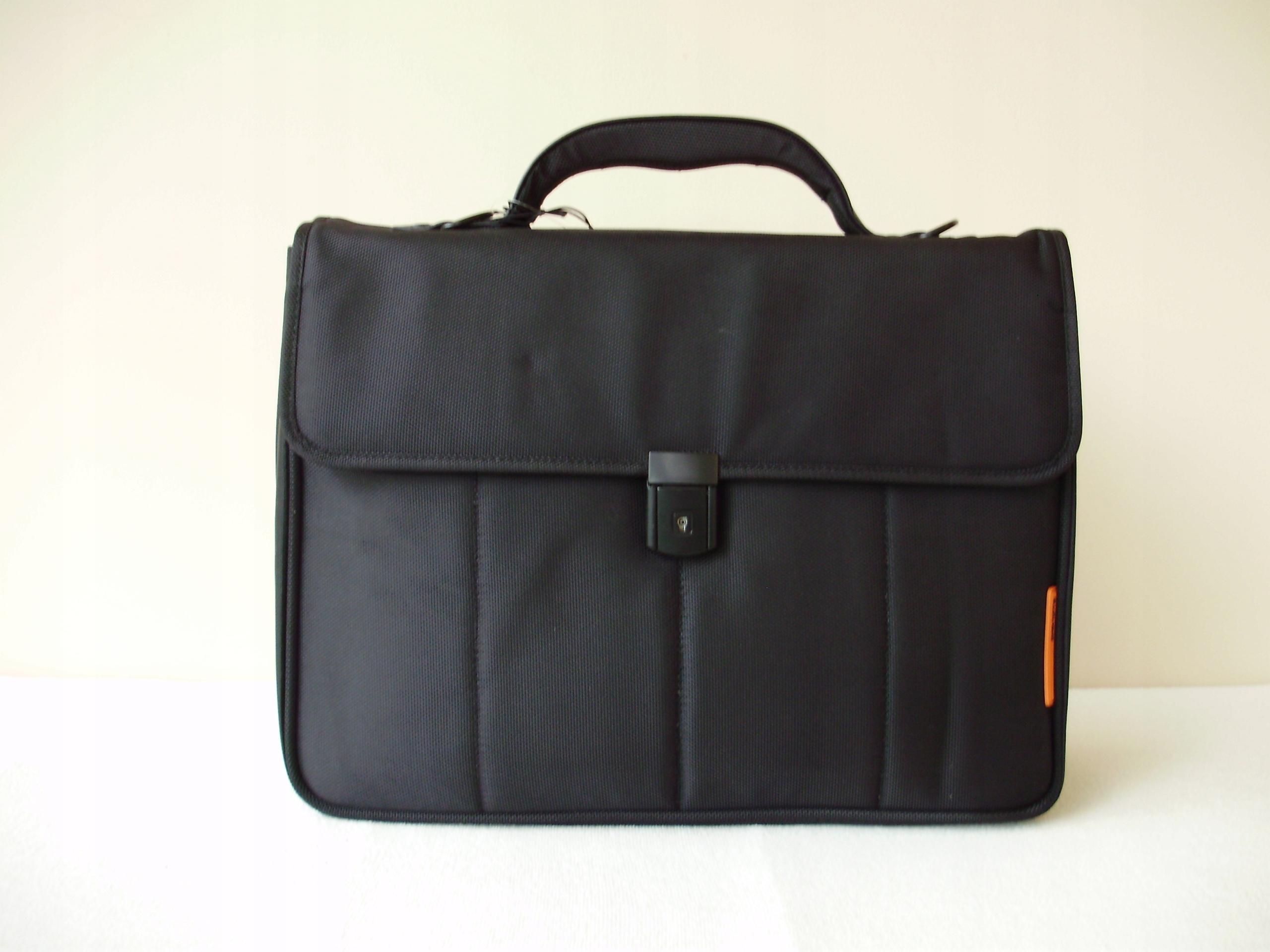 Продаю мужской портфель от David's, модель 257.110, с 2 отделениями и большим карманом с органайзером. Портфель очень прочный, большой и вместительный, очень функциональный. Закрывается клапаном и ключевым замком (два ключа в комплекте). В первом отделении от корпуса есть карман поменьше для ноутбука до 15,6" и небольшой карман для планшета до 10", оба усилены и облицованы поролоном. Во 2-м отделении от корпуса имеется большой карман на молнии. В этом отделении под клапаном имеется дополнительный большой карман с органайзером, то есть несколько маленьких накладных карманов и два больших кармана на молнии. Сзади имеется внешний карман на молнии и эластичный ремень для крепления к чемодану. Портфель оснащен съемным длинным регулируемым тканевым ремнем с удобным подплечником (длина ремня с карабинами 138 см, ширина 3,8 см, размеры подплечника 20,5 х 7 см). Цвет черный с оранжевыми вставками, выполнен из полиэстера 1680D плюс ПУ, вставки из ПУ/скай расположены сверху на рукоятке и снизу наплечника. Имеет жесткую ручку на клапане и металлические петли с обеих сторон для крепления плечевого ремня. Внутренняя подкладка портфеля черная. Молния портфеля открывается расстегиванием центральной части молнии снизу вверх.