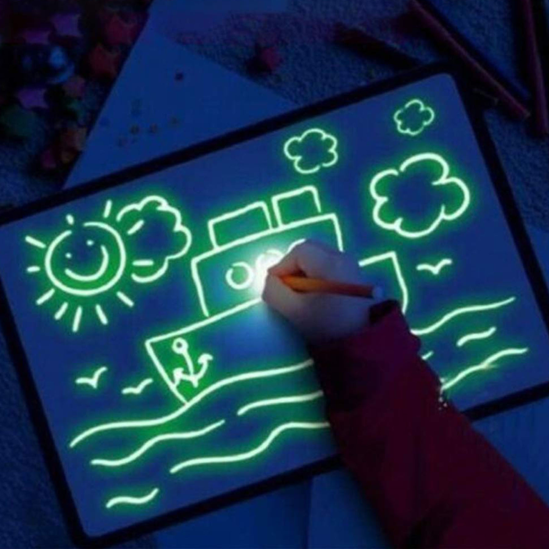 Доска для рисования с волшебным светом — это современная игрушка, которая позволяет стимулировать творческие способности вашего ребенка. При рисовании ребенку не нужны карандаш, мелки или фломастеры, только УФ-ручка и затемненная комната.