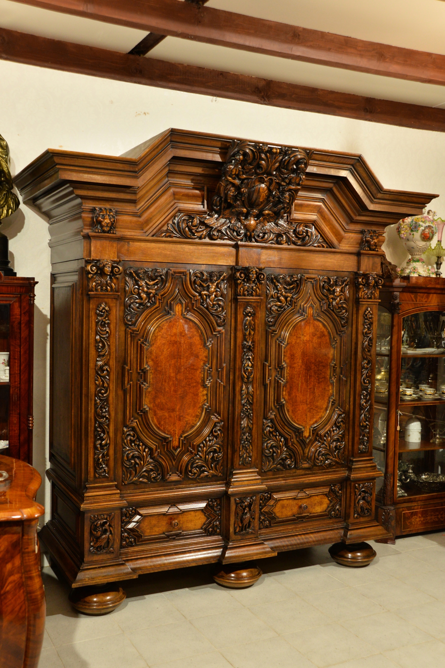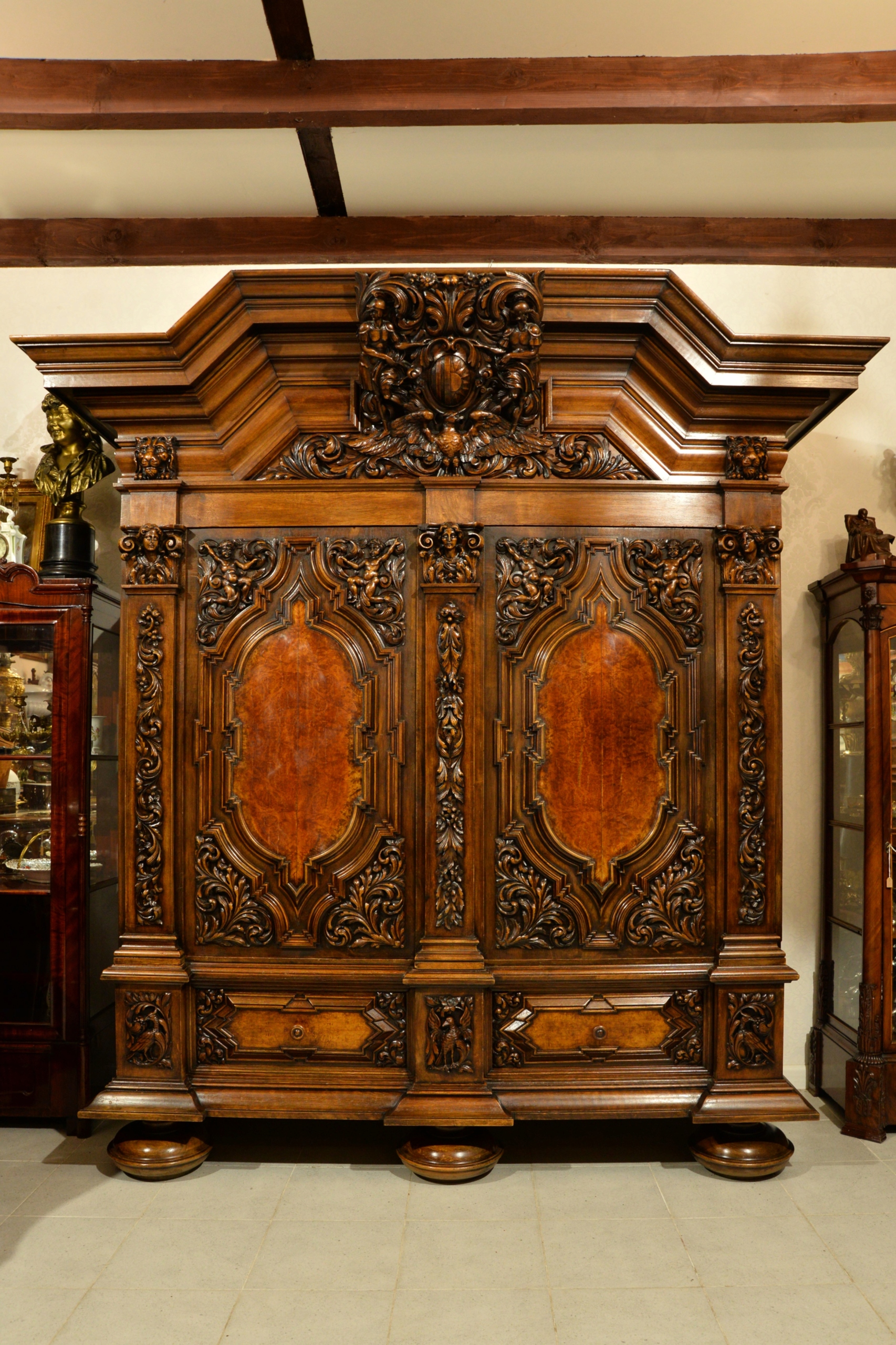 - шкаф имеет все типичные для гданьской мебели черты: массивная конструкция с большим обширным карнизом и богатой резьбой,