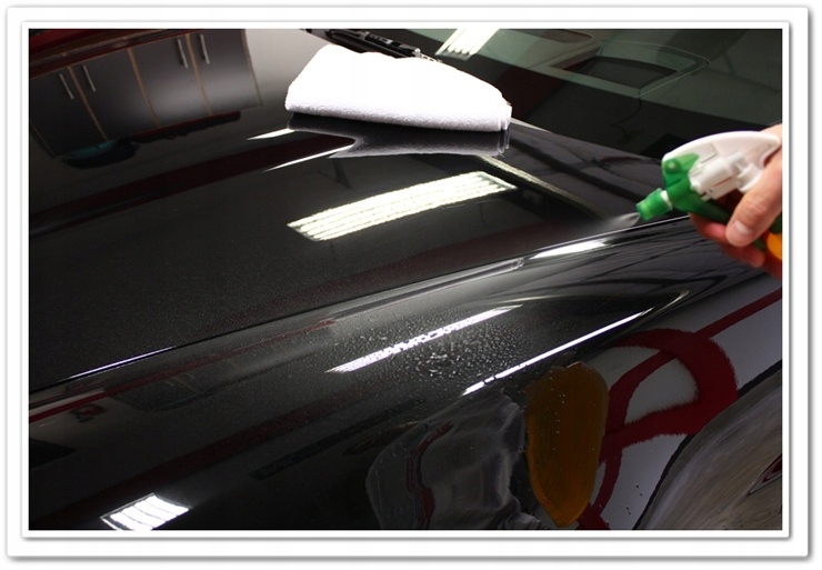 мы распыляем автомобильный элемент чистой водой, затем потирая лак глиной с помощью скользящего движения, собирая примеси