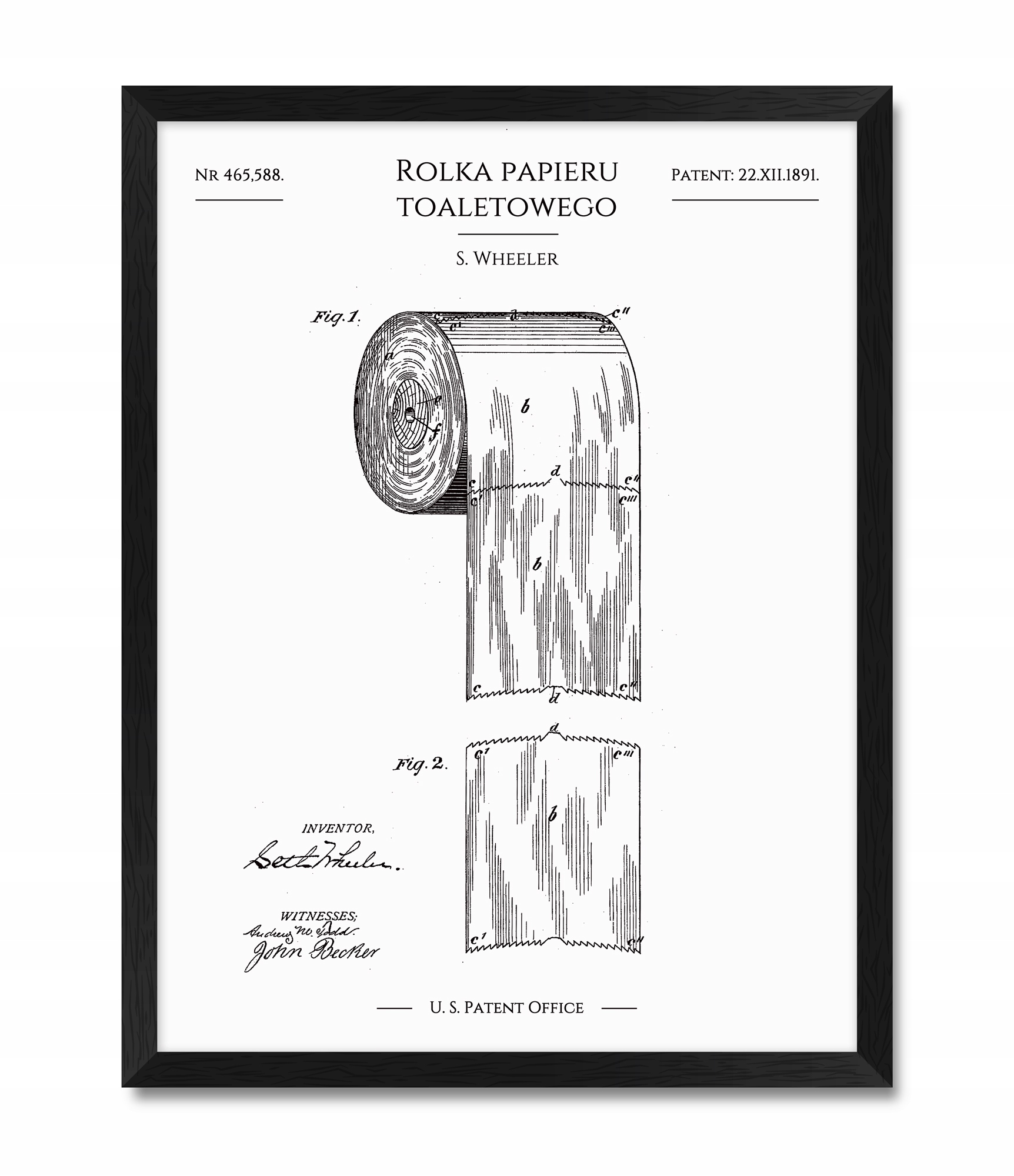 Предлагаю картину в рамке под дерево, которая является перепечаткой патента на рулон туалетной бумаги. б> представлено С. Уилером в 1891 г. в Патентное ведомство США. Картина выполнена в полонизированной номенклатуре и имеет внешние размеры 32,3 х 42,3 см. Размер картины (внутри рамы) 30 см х 40 см. Рисунок рисунка напечатан методом цифровой печати на нежной ламинированной бумаге «Арктика» плотностью 300 г. Лицевая сторона рисунка также защищена прозрачным оргстеклом.