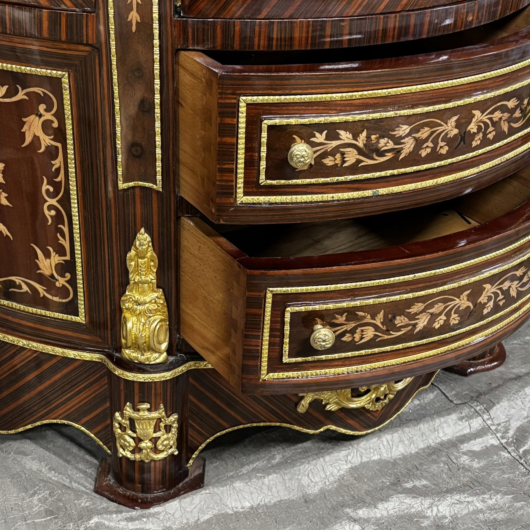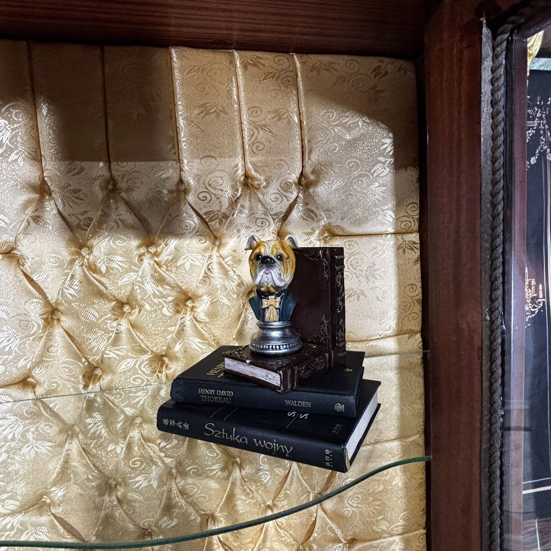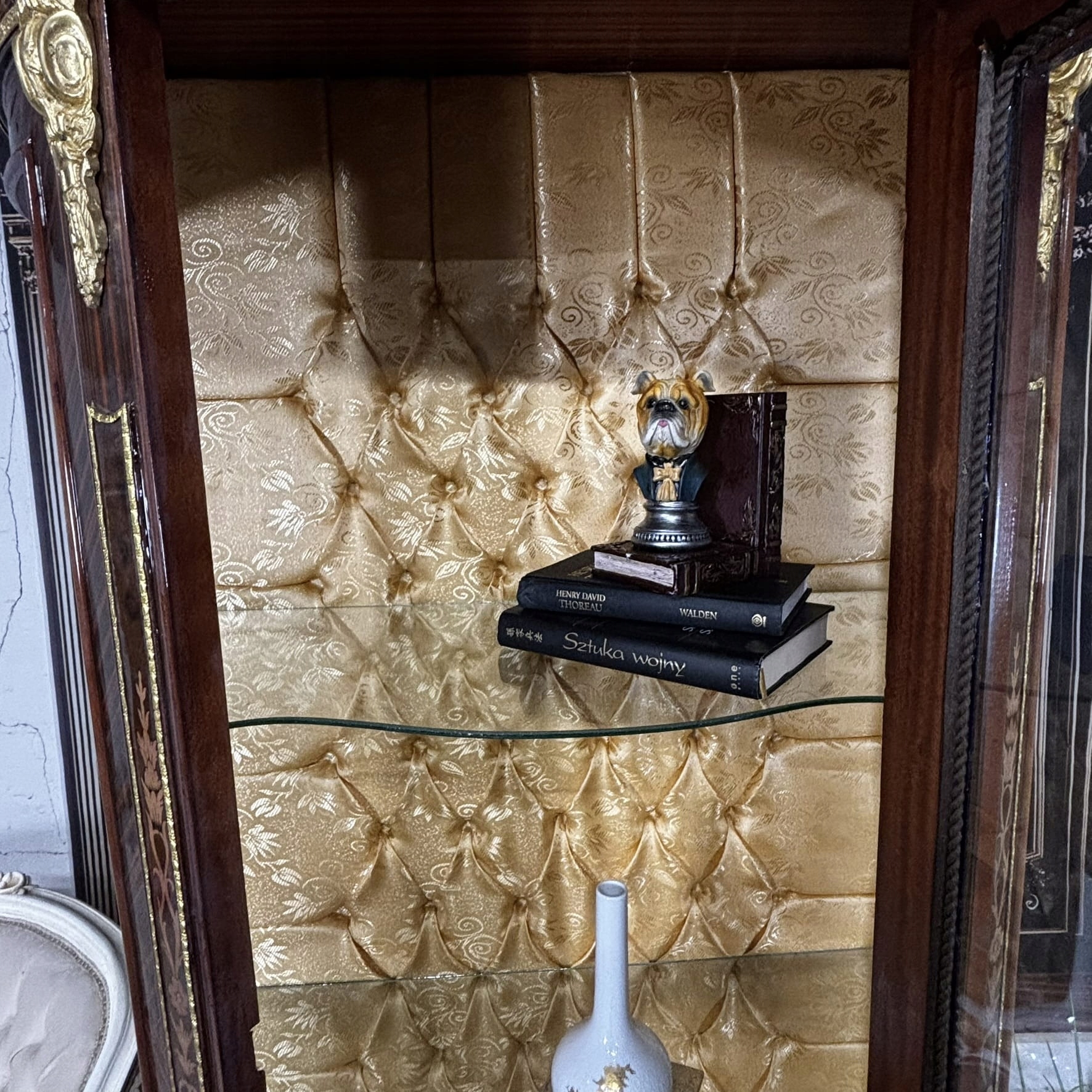 Большая классическая витрина с позолотой и стеганой внутренней частью