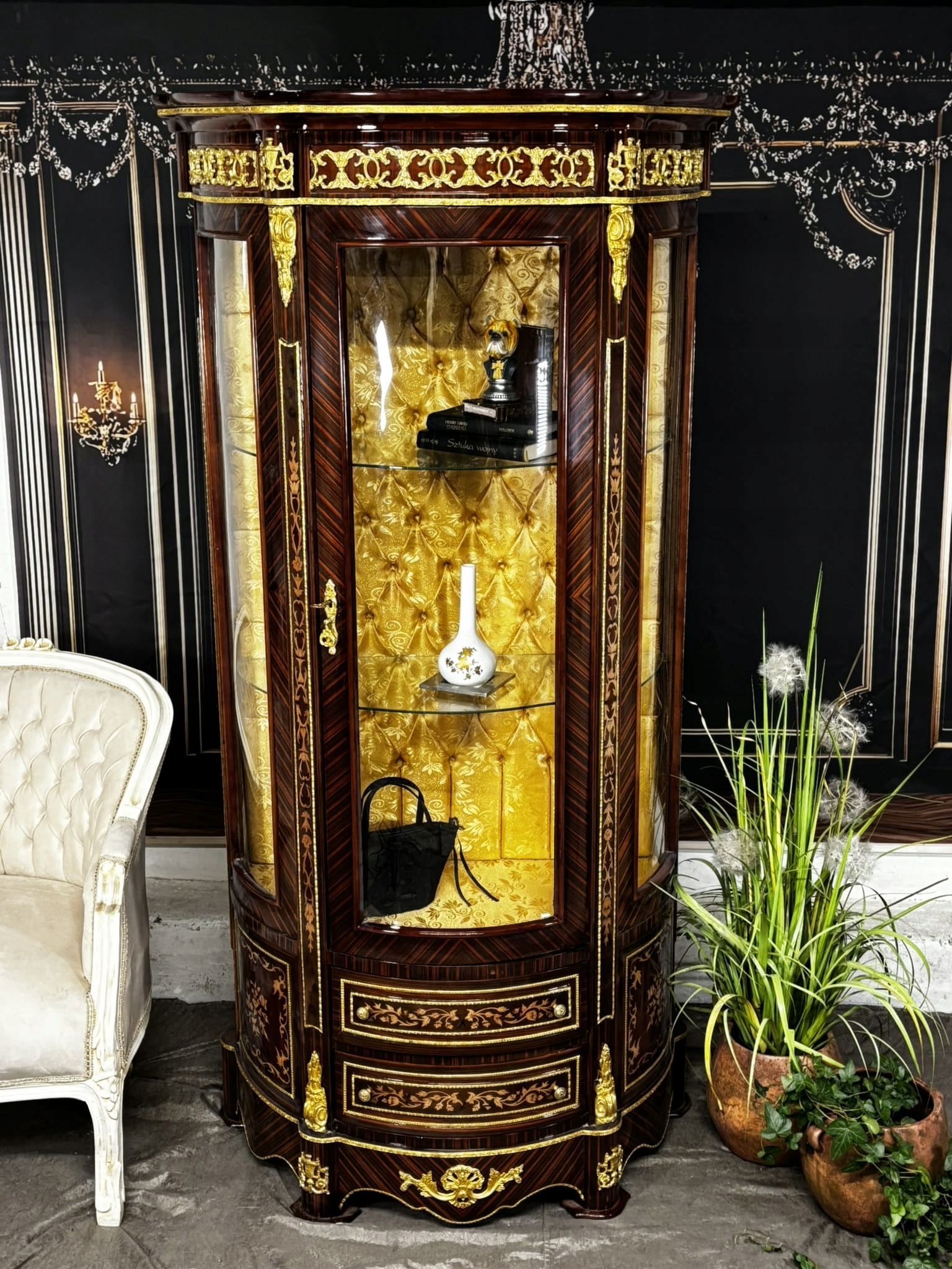 Внутренняя часть витрины отделана стеганым материалом оттенка золота, что подчеркивает ее эксклюзивный характер. Позолоченные детали, в том числе изысканные ручки и украшения, отсылают к эстетике классицизма, придавая мебели исключительный престиж. Это идеальный выбор для гостиной, столовой или элегантного офиса.