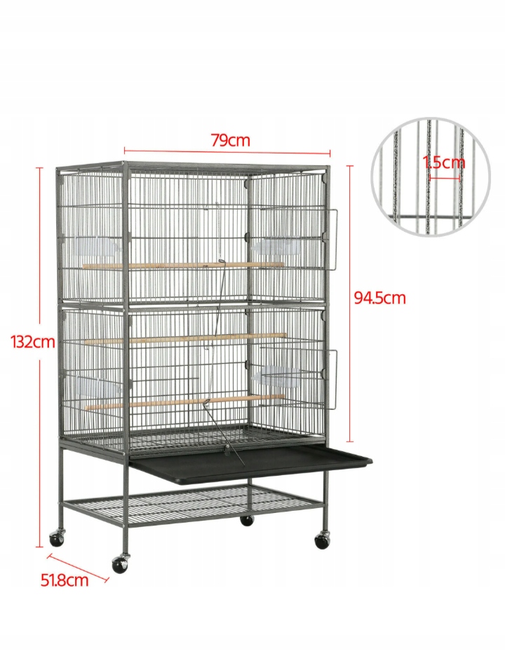 Из-за очень большого размера эту клетку может быть трудно передвигать, требуя небольших усилий. б>. Однако наша клетка для попугая, которая стоит на 4 прочных колесах, прекрасно решила эту проблему.