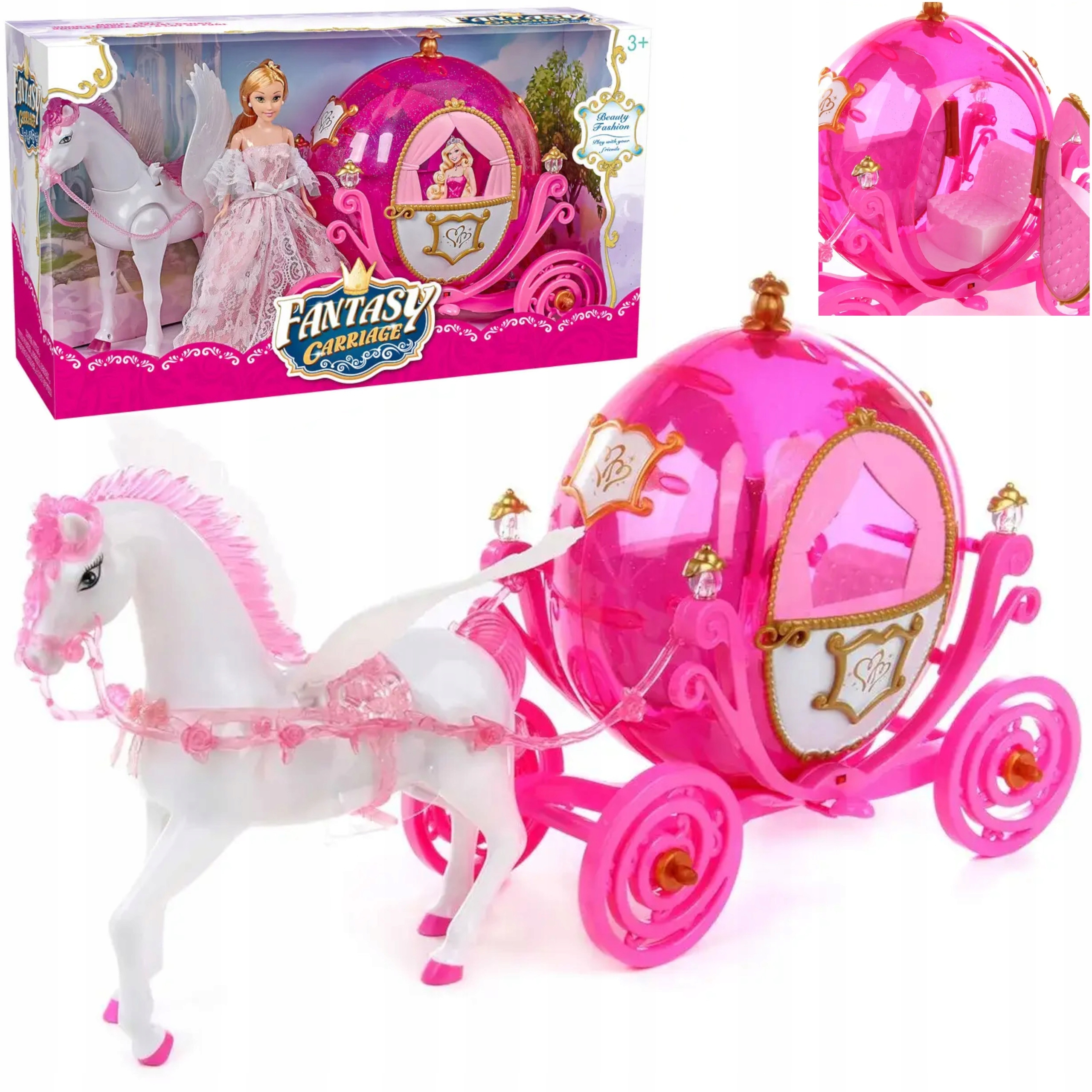 Коляска, в которую легко поместится кукла, — сказочное транспортное средство. Коляска круглая, изготовлена из прозрачного розового пластика, поэтому вы можете наблюдать за куклой, сидящей внутри. У нее четыре больших вращающихся колеса, которые облегчают перемещение коляски по полу. В вагоне также есть двери, открывающиеся в обе стороны. Он красивоукрашен золотыми элементами и имеет удобное место для принцессы, а с четырех его сторонмигают четыре красных и синих огонька.