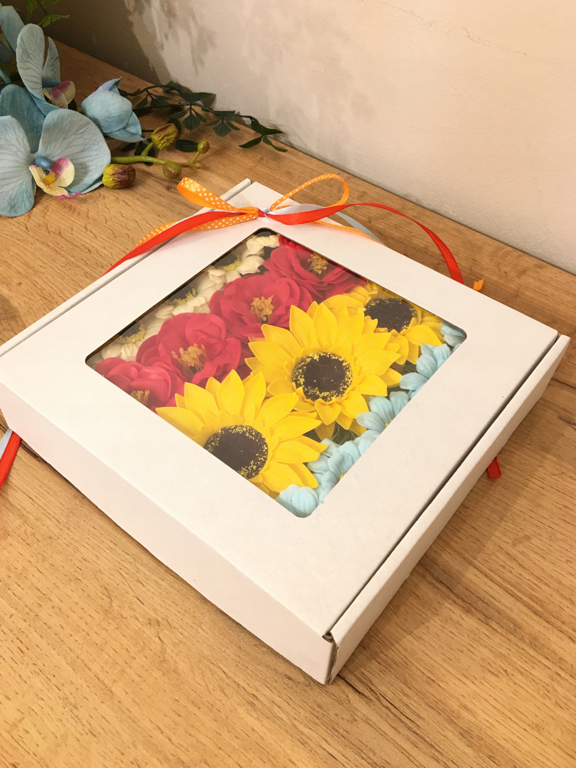 ЦВЕТОЧНАЯ КОРОБКА большая, Ароматическое мыло ЦВЕТЫ в подарок - АРОМАТИРОВАННОЕ МЫЛО МАРГАРЕТКИ, КАМЕЛИЯ, ПОДСОЛНУХ