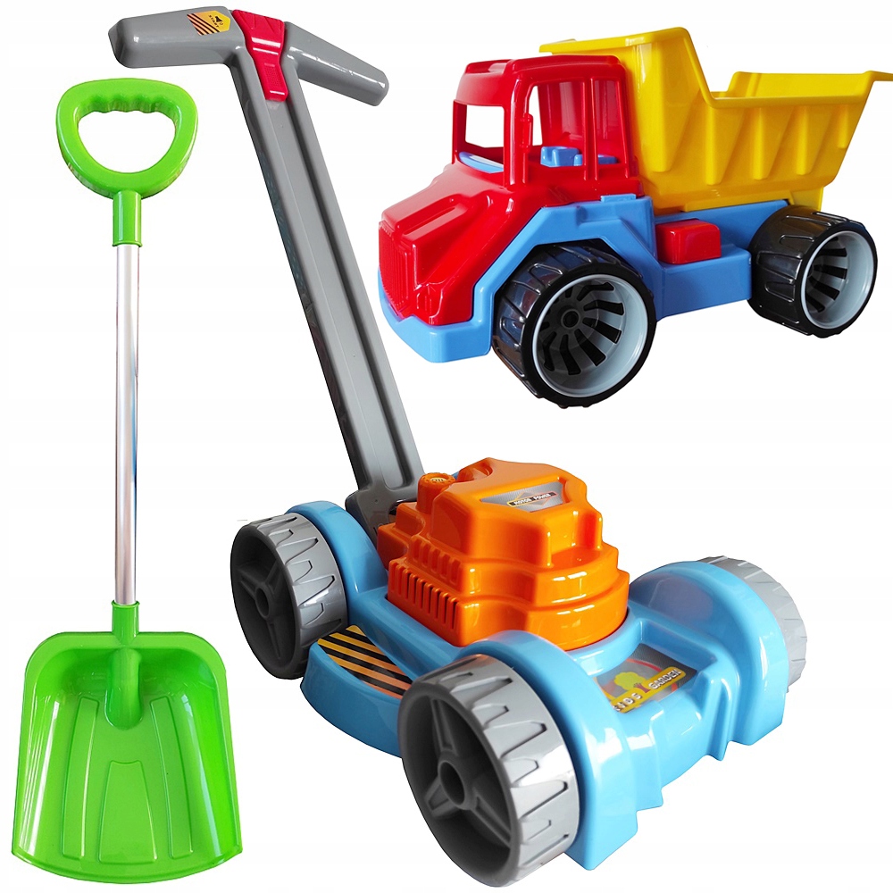 Отличный большой набор: косилка для небольшого садовника со звуком стрельбы двигателя и косителя травы + на выбор: самосвальный грузовик, бетонный миксер или мусорный грузовик + большая лопата - Новая !!! - Польский продукт !!!
