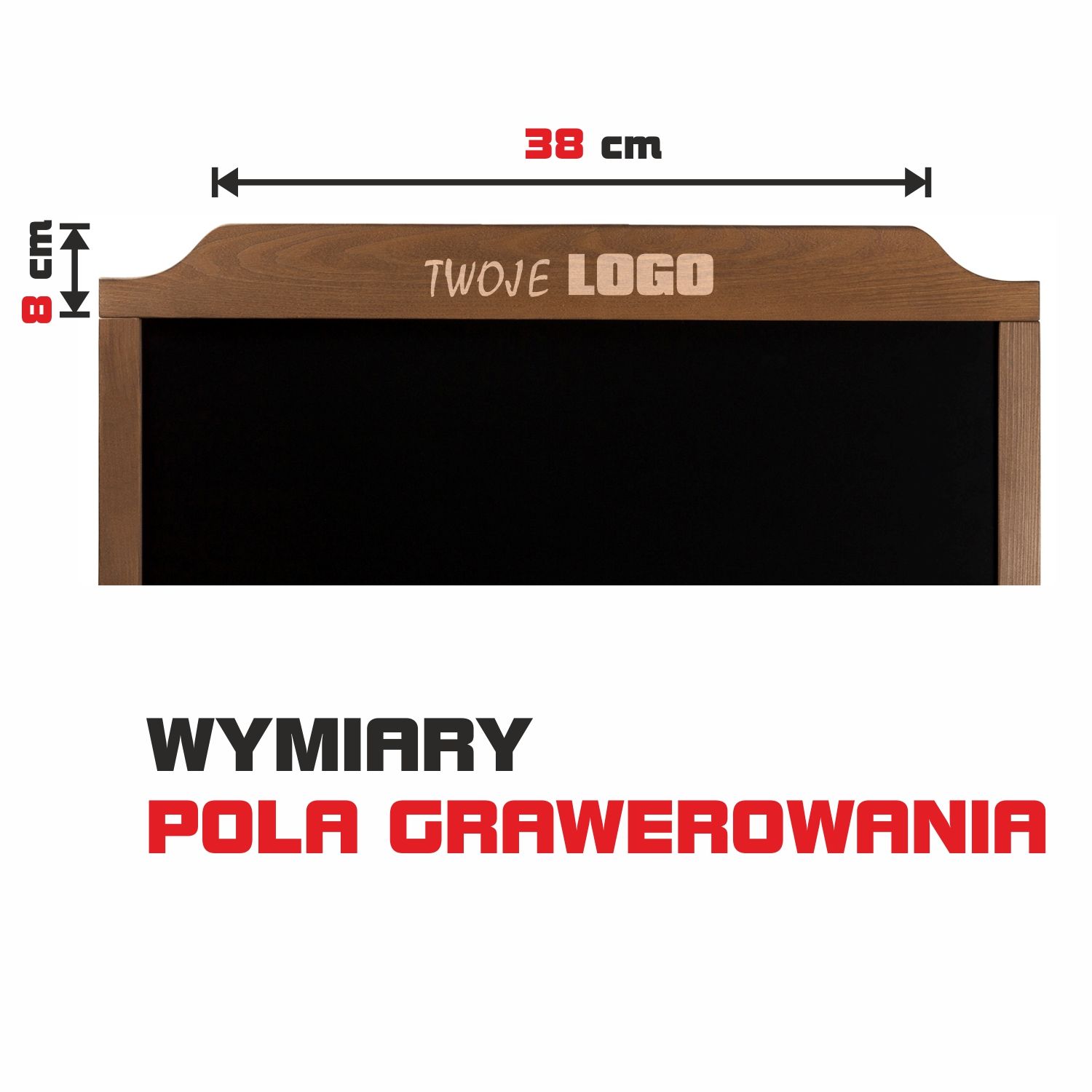Большая горизонтальная меловая табличка в деревянной раме с верхней полосой в форме волны. Вы можете написать после этого с маркером мела или мела. Доска привлекает внимание, и из -за его большого размера она может быть расположена на большем расстоянии от получателя. Это отлично смотрится на мольберте. На высшей доске доски вы можете дополнительно выгравировать свой логотип, название компании или рекламу лазером. Доска с гравировкой определенно привлекает внимание потенциальных клиентов.