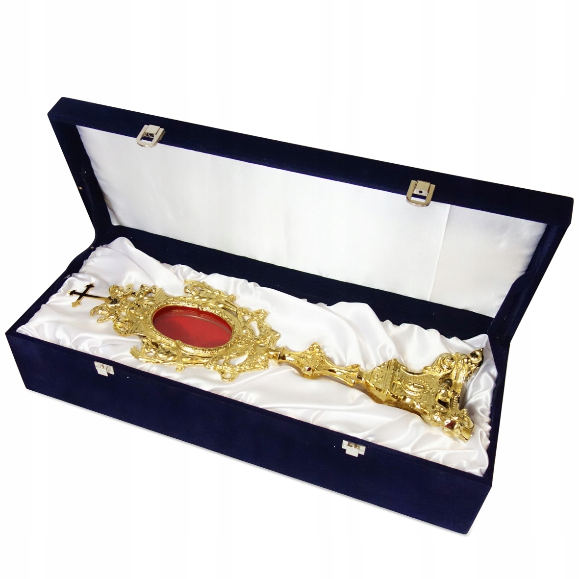 Реликварий включает в себя элегантный темно-синий футляр, облицованный внутри белой атласной тканью. Кейс идеально подходит для хранения и безопасной транспортировки реликвария.