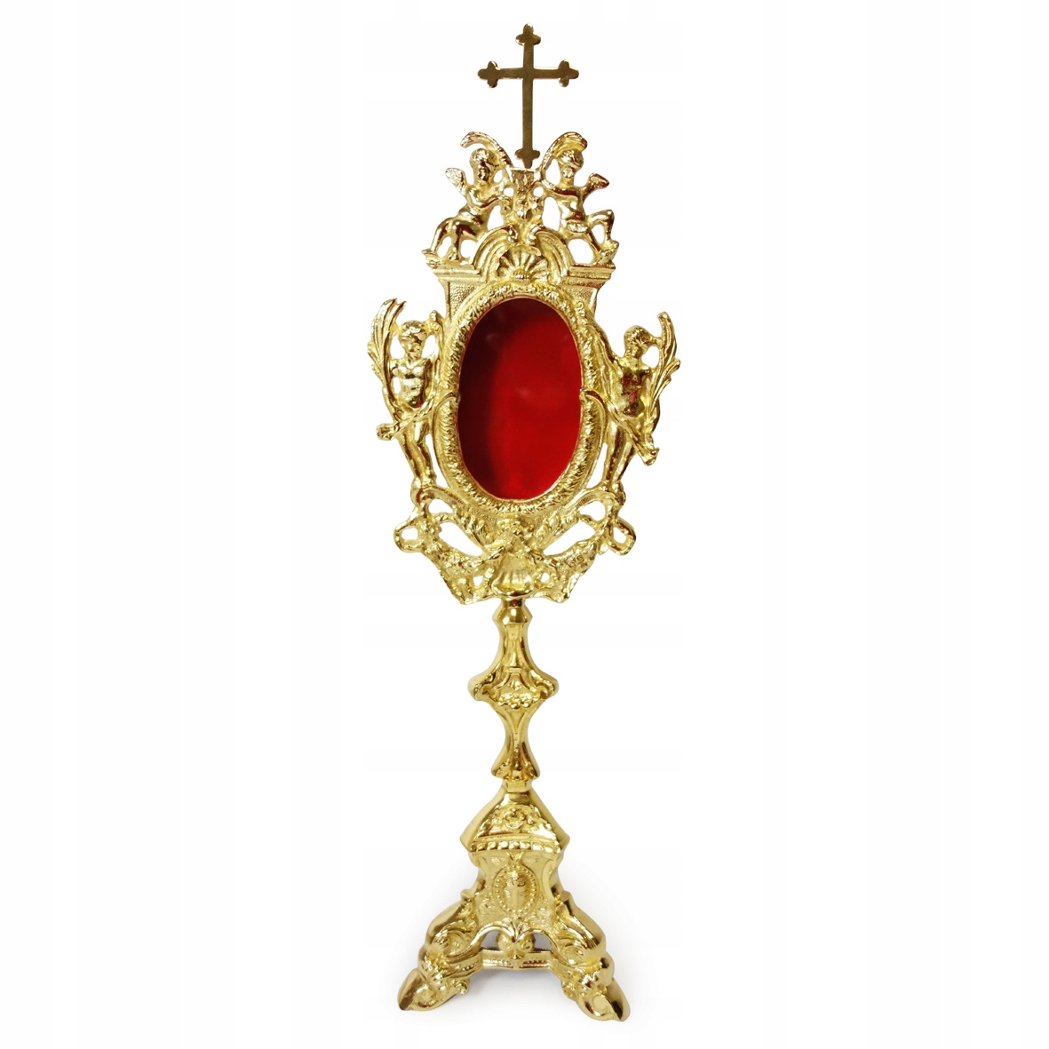 Уникальный латунный реликварий, выполненный в технике точного литья, с красивым, богатым орнаментом в классическом стиле. В центре находится большая луна в форме эллипса, прекрасно отображающая реликвии. Реликварий имеет устойчивую трехопорную основу, обеспечивающую безопасное позиционирование. Все это увенчано плоским крестом, тонко подчеркивающим сакральный характер сосуда.