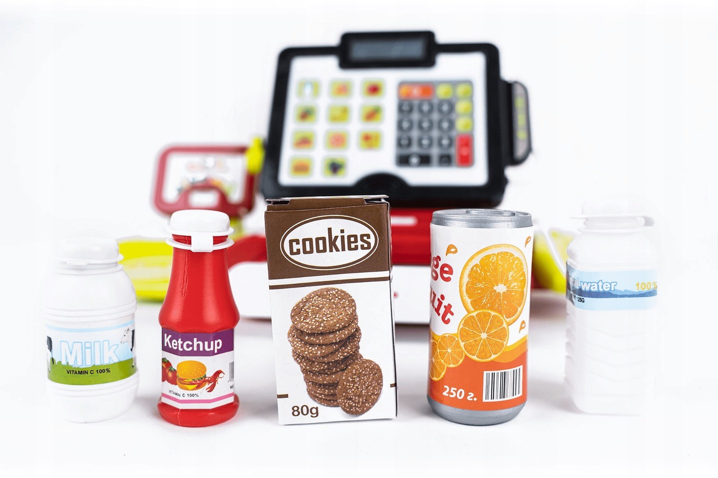 Кассовый аппарат включает в себя ящик с монетами и банкнотами, «картридер», платежную карту, «микрофон» (имитация), бумажные банкноты и пластиковые монеты, а также другие аксессуары (печенье, молоко, кетчуп, минеральная вода, апельсиновый сок).