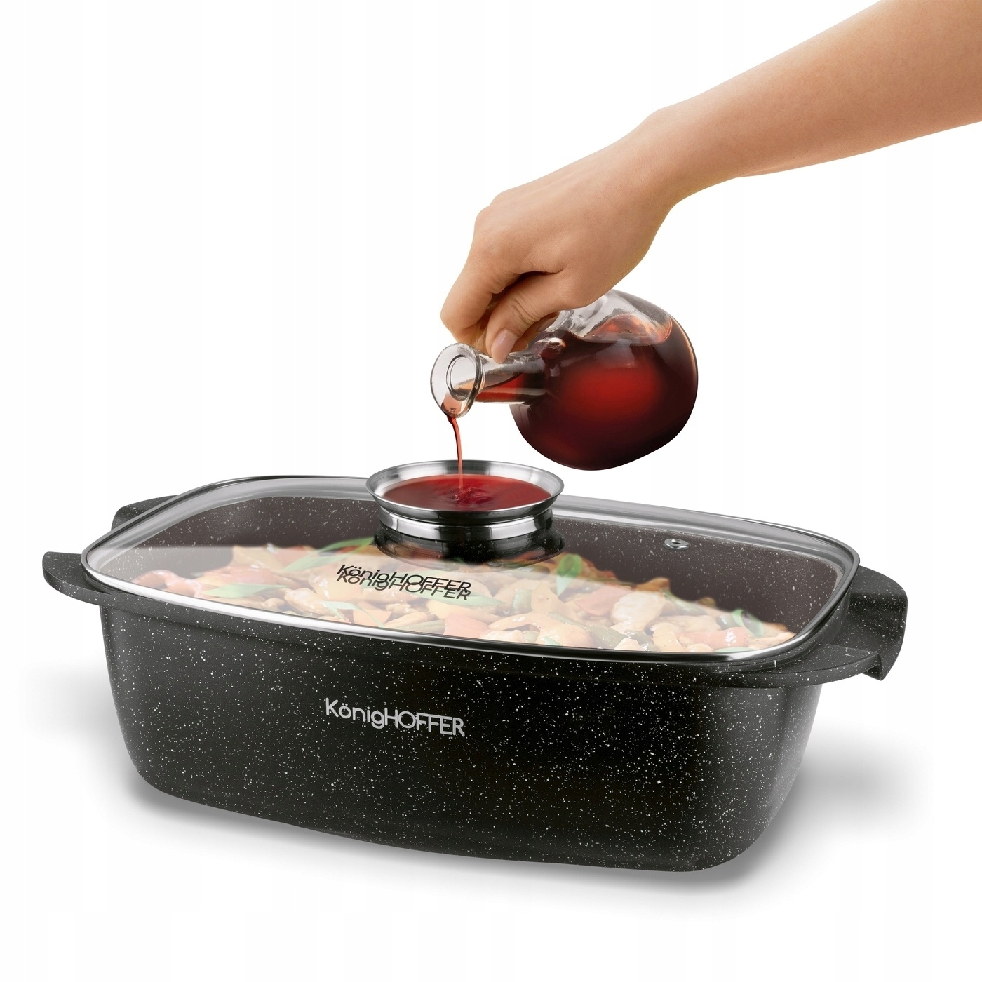 Прямоугольная жаровня Konighoffer Pollo (объемом 5,5 л) обеспечит вам высокий уровень комфорта во время приготовления пищи. Он защитит ингредиенты от пригорания и прилипания. Он будет нагреваться равномерно и быстро. Это позволит эффективно тушить под крышкой и постоянно контролировать процесс приготовления блюда. Вы получаете многолетнюю долговечность благодаря литому под давлением алюминиевому корпусу и каменно-мраморному покрытию без содержания ПФОК, устойчивому к многочисленным циклам истирания. Это вариант для всех, кто ценит здоровую и питательную диету, например, приготовленную с минимальным количеством жиров. Беспроблемный уход и долгий срок службы посуды из мрамора – другие основные преимущества приобретения этой модели жаровни, имитирующей рисунок гранита. Вы можете использовать его на всех типах плит. Товар продается в наборе со стеклянной крышкой, оснащенной ароматизатором. Его можно использовать в духовке при максимальной температуре. 220 градусов С, но без крышки.