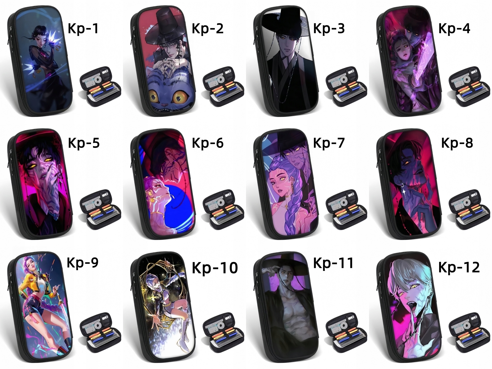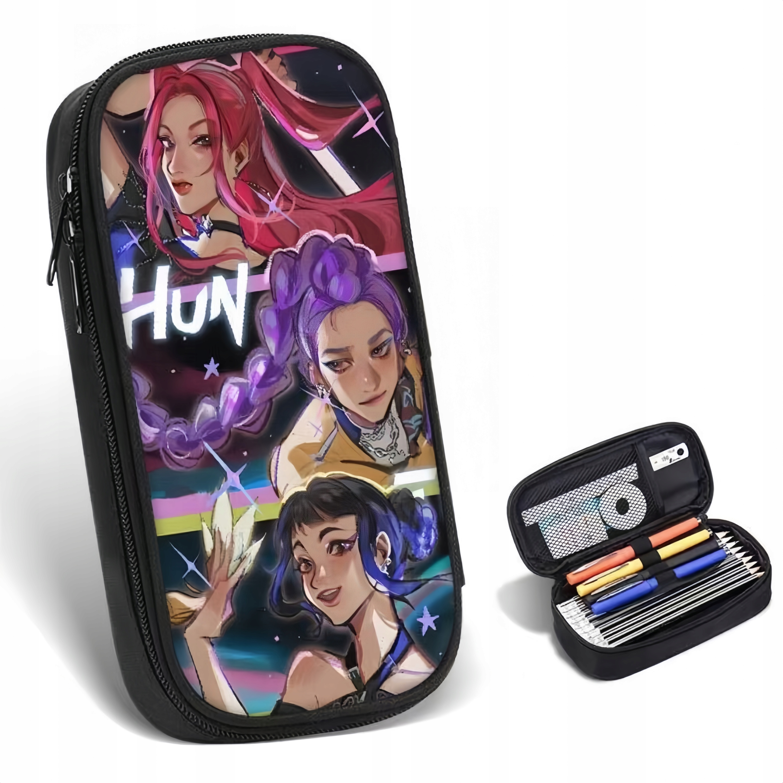 Пенал KPop Demon Hunters, основной цвет, с изображением героев мультфильмов, в том числе Руми Миры, Зои и других, напечатанных спереди. Узоры красочные, а дизайн персонажей яркий. На передней панели изображены персонажи, а внутреннее пространство достаточно велико, чтобы вместить различные канцелярские принадлежности и оборудование.