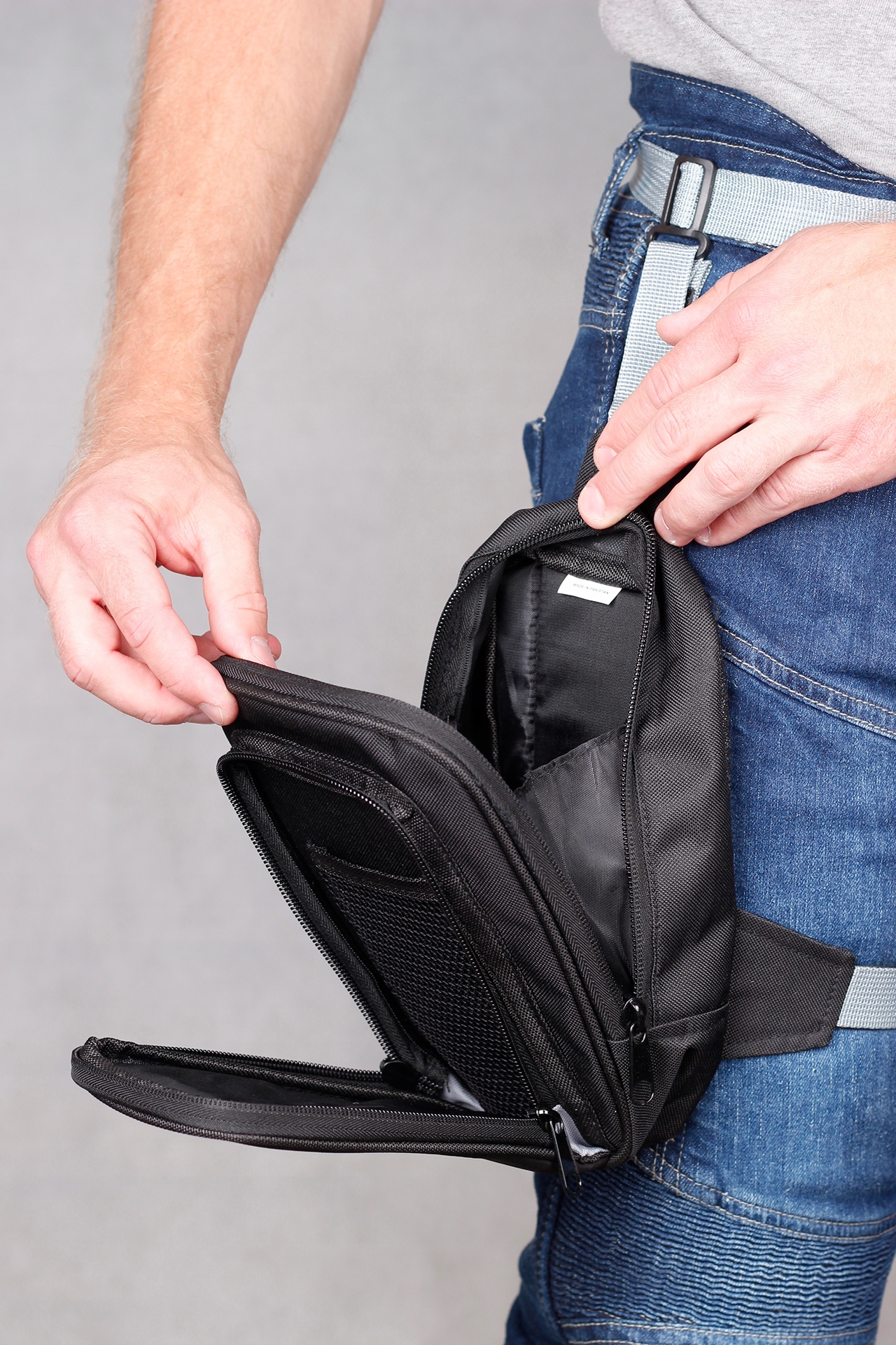 - Прорезиненная поверхность внутри, стабилизирующая сумку на ноге.