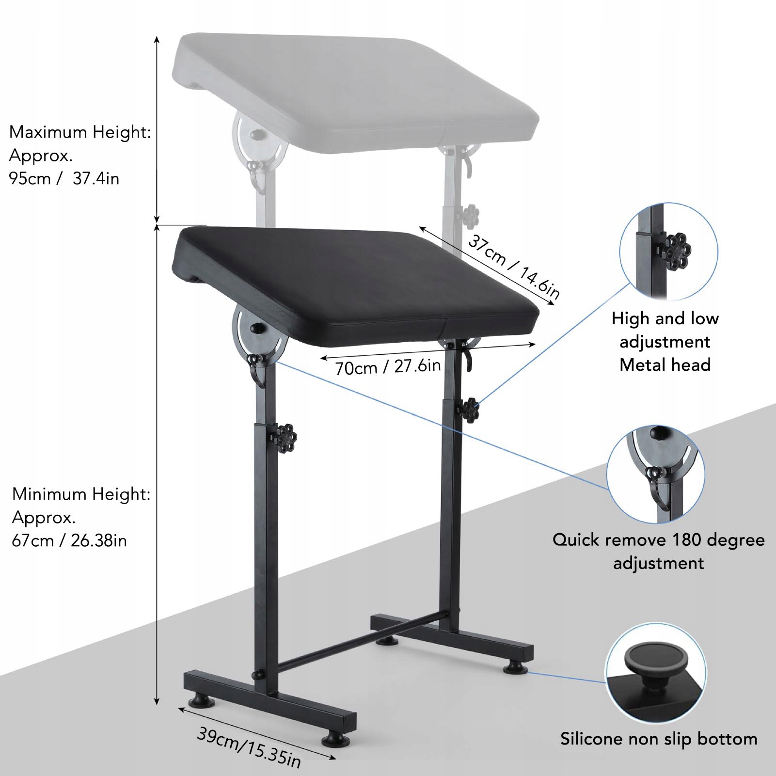 1. Регулируемая высота: он эргономичен для обеспечения комфорта при нанесении татуировки и имеет регулируемую высоту от 26,38 до 37,4 дюйма для удовлетворения различных потребностей клиентов и мест татуировки на теле, включая руку и ногу.