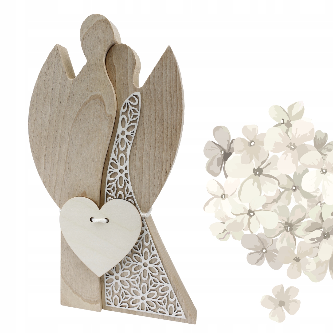 - Два ангела высота 26 см, толщина 2,5 см. Ангелы изготовлены из букового дерева, привязаны к струне с эмблемой в форме сердца из дерева. Ангел, символизирующий женскую форму, дополнительно украшена открытым платьем из Берамата