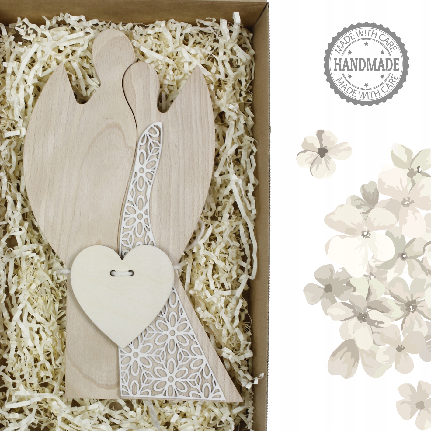 - декоративная коробка с надрезом, наполненная деревянной шерстью с приклеенными эмблемами тех же ангелов, которые находятся в съемочной площадке, и деревянное сердце