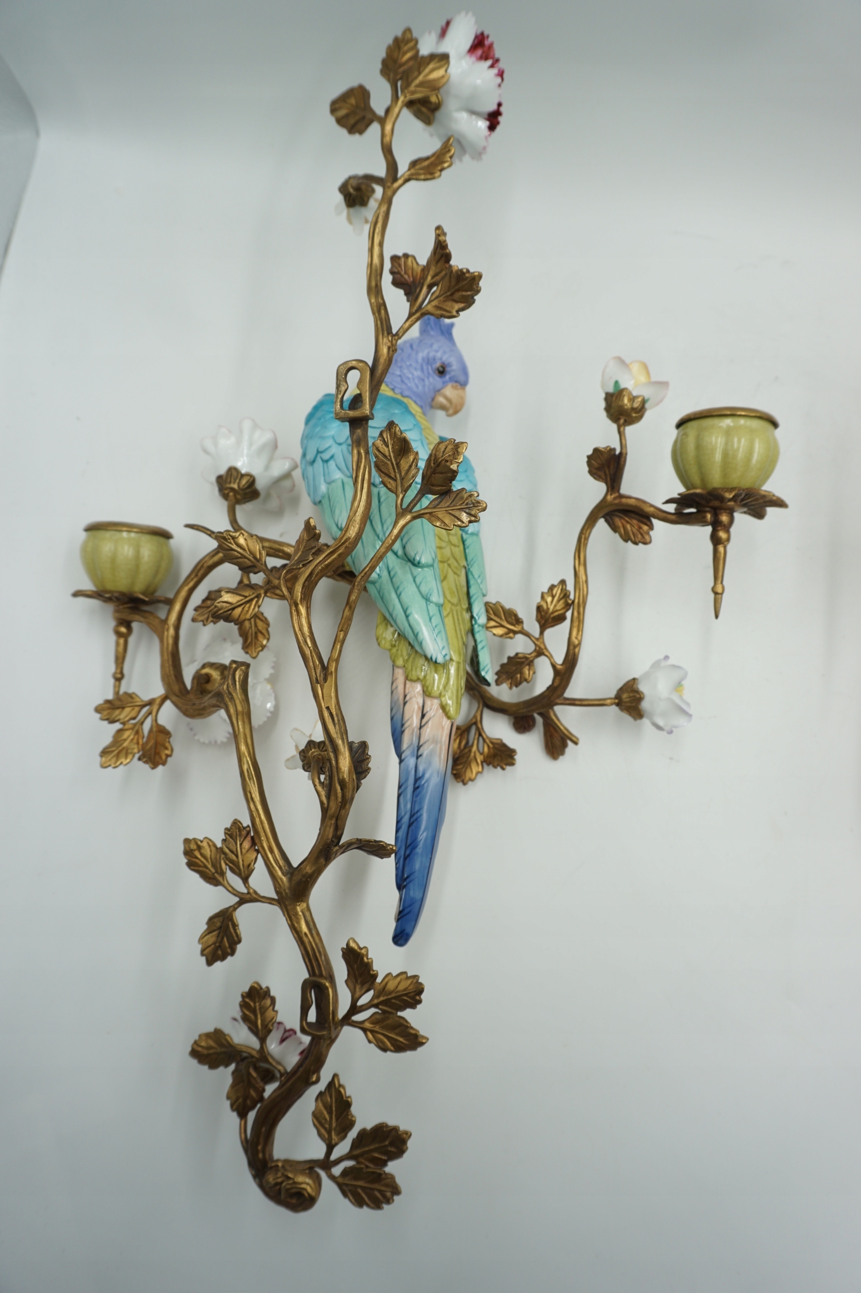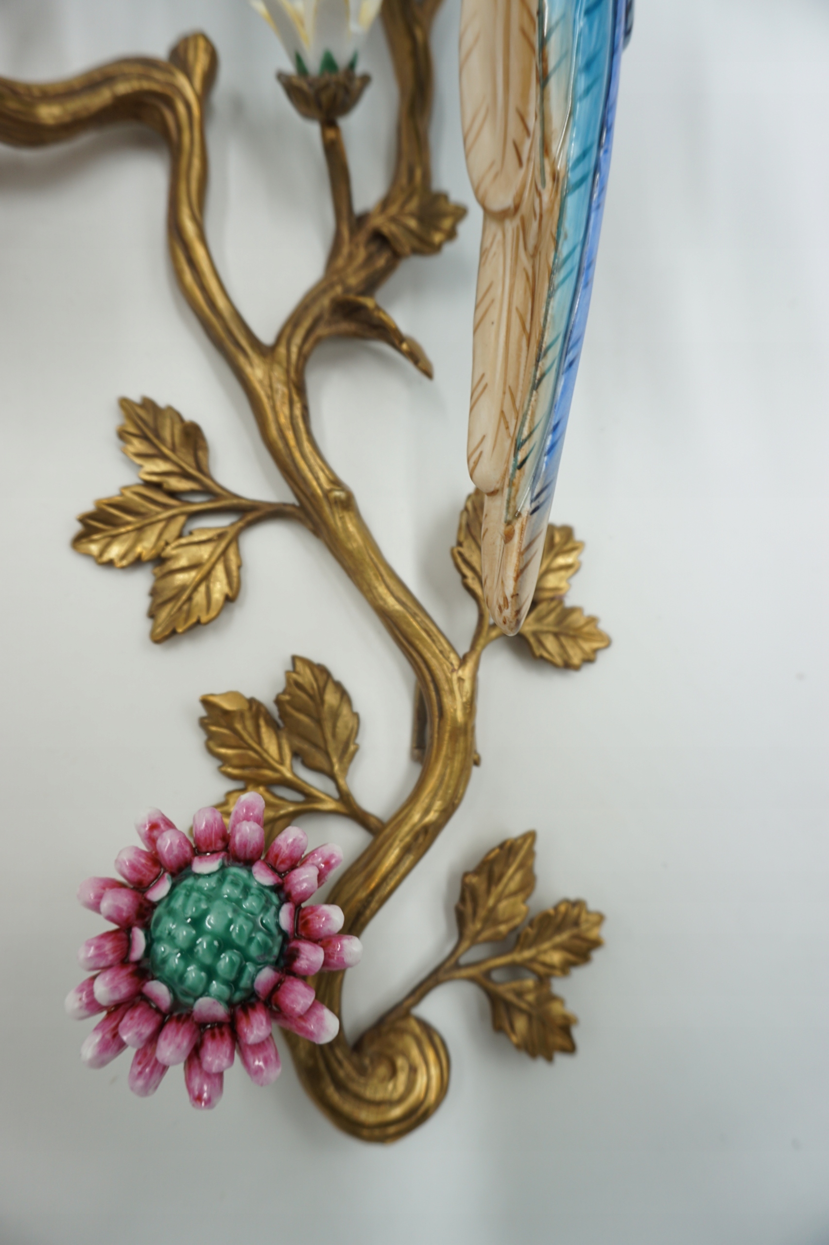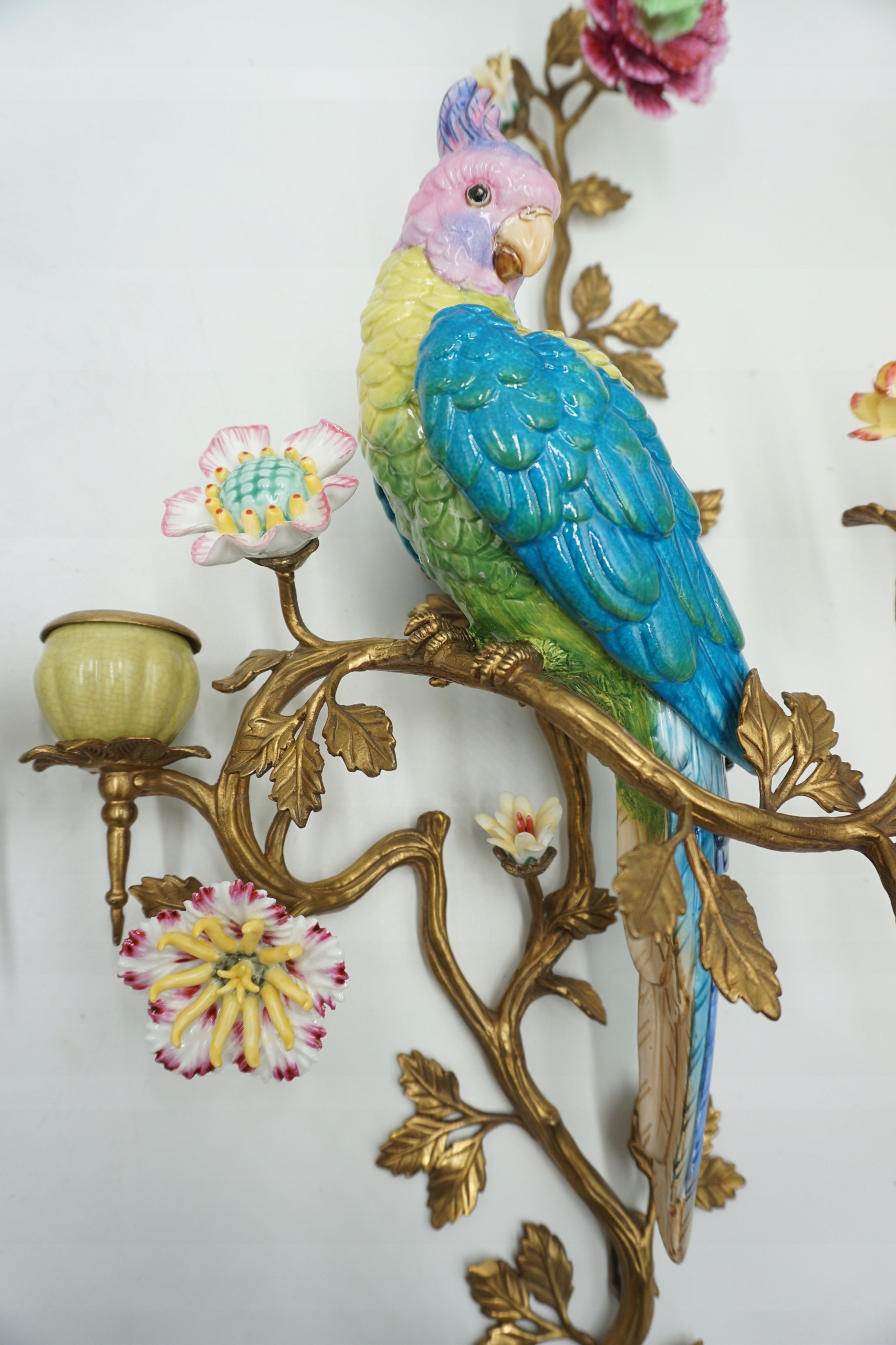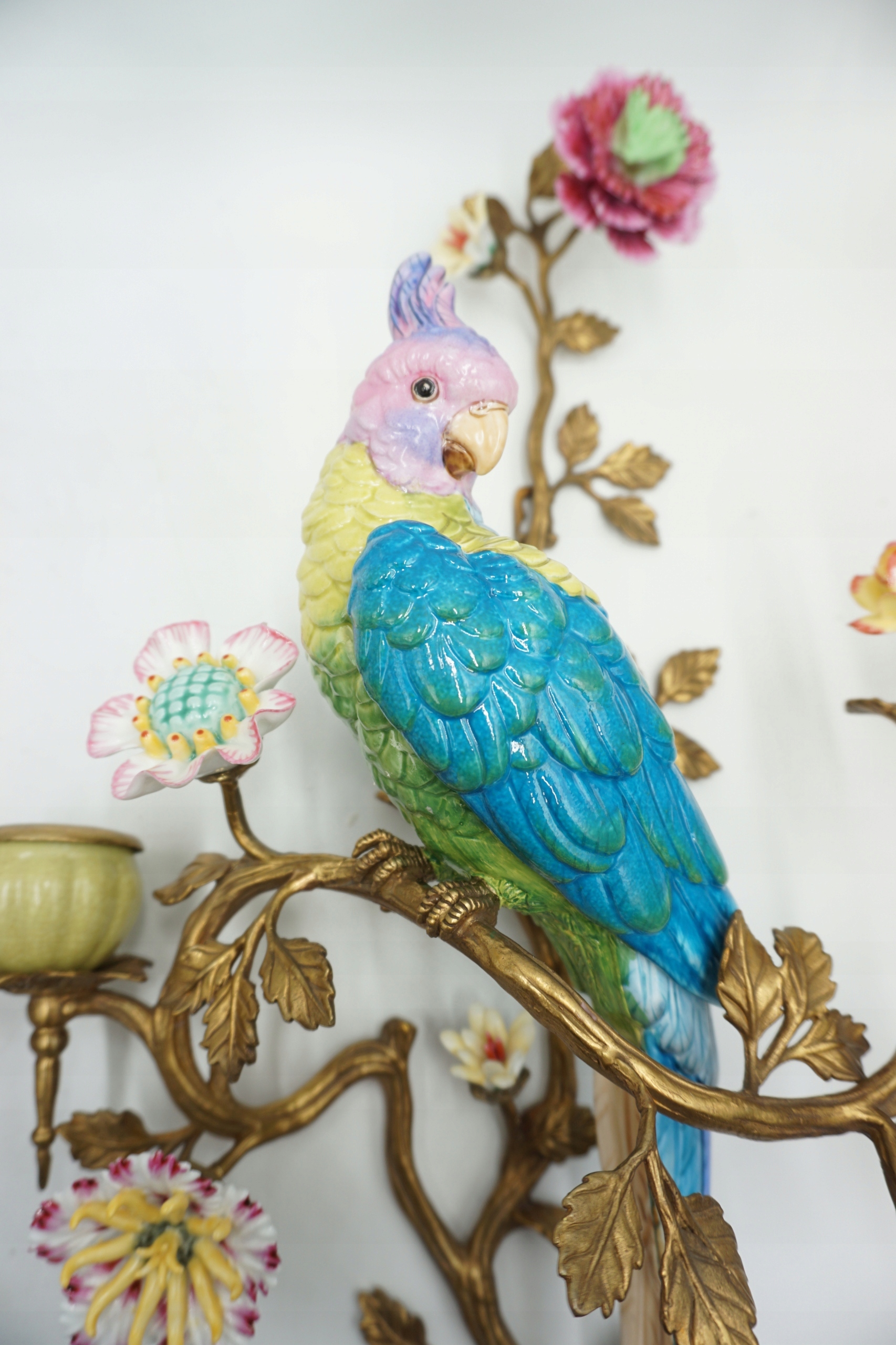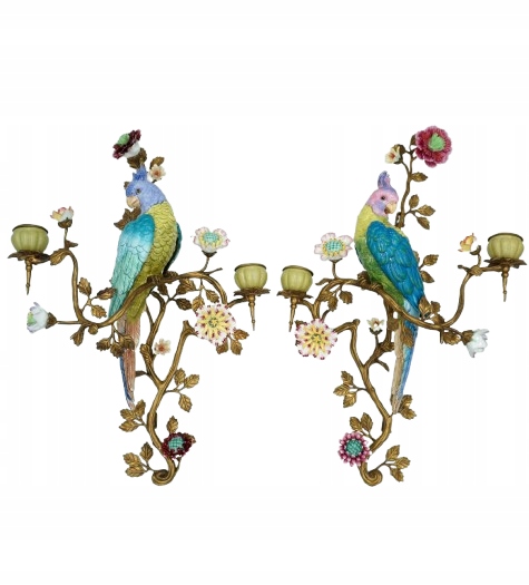 Большая пара настенных ламп из попугаев фарфоровых фарфоровых цветов с коричневыми.
