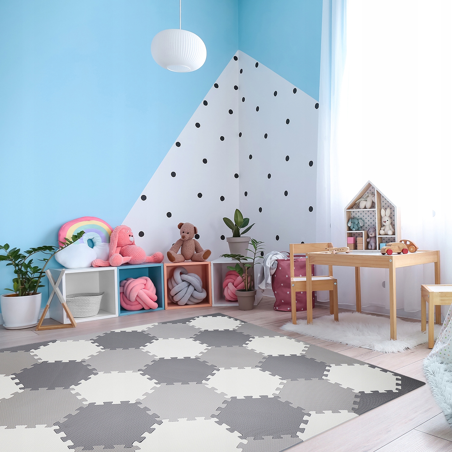 Коврик состоит из пазлов шестиугольной формы, которые обязательно привлекут внимание каждого ребенка и побудят его к игре. Они станут прекрасным украшением любой комнаты и придадут ей неповторимую атмосферу.