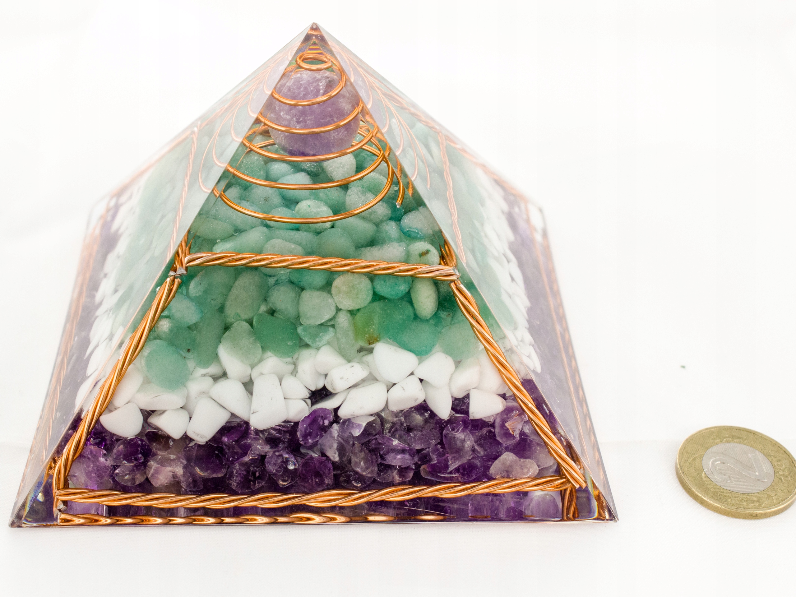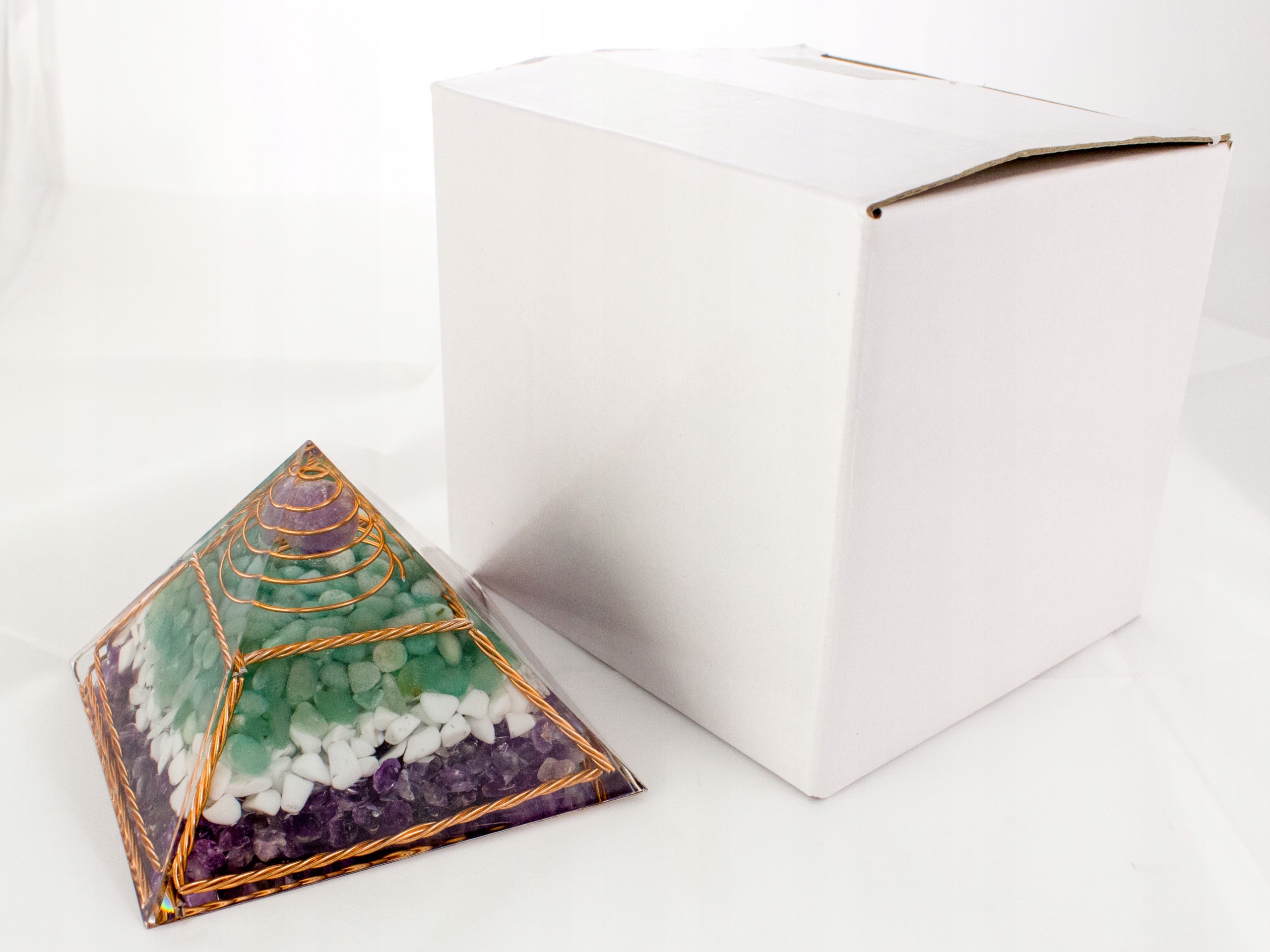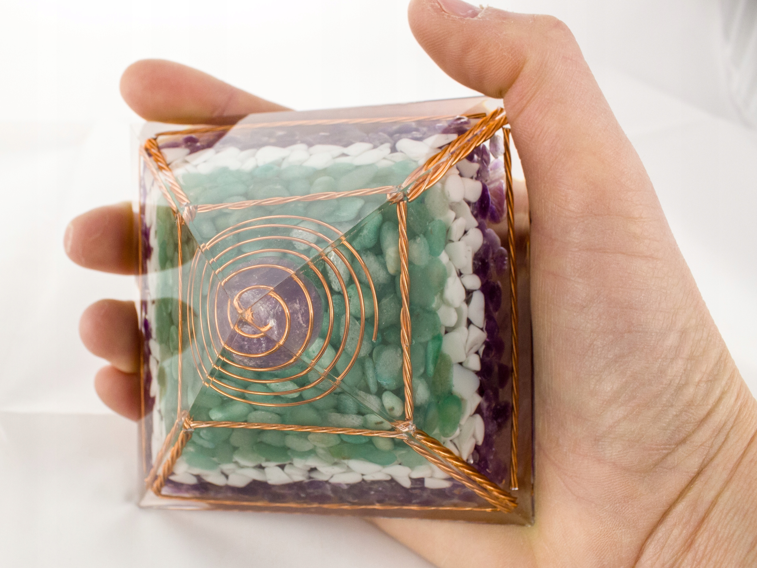 Большая пирамида из оргонита с аметистом, белым агатом, зеленым авантюрином, флюоритом и чистой медью, расположенными таким образом, чтобы максимизировать силовое энергетическое воздействие , превращая плохую энергию в хорошую.