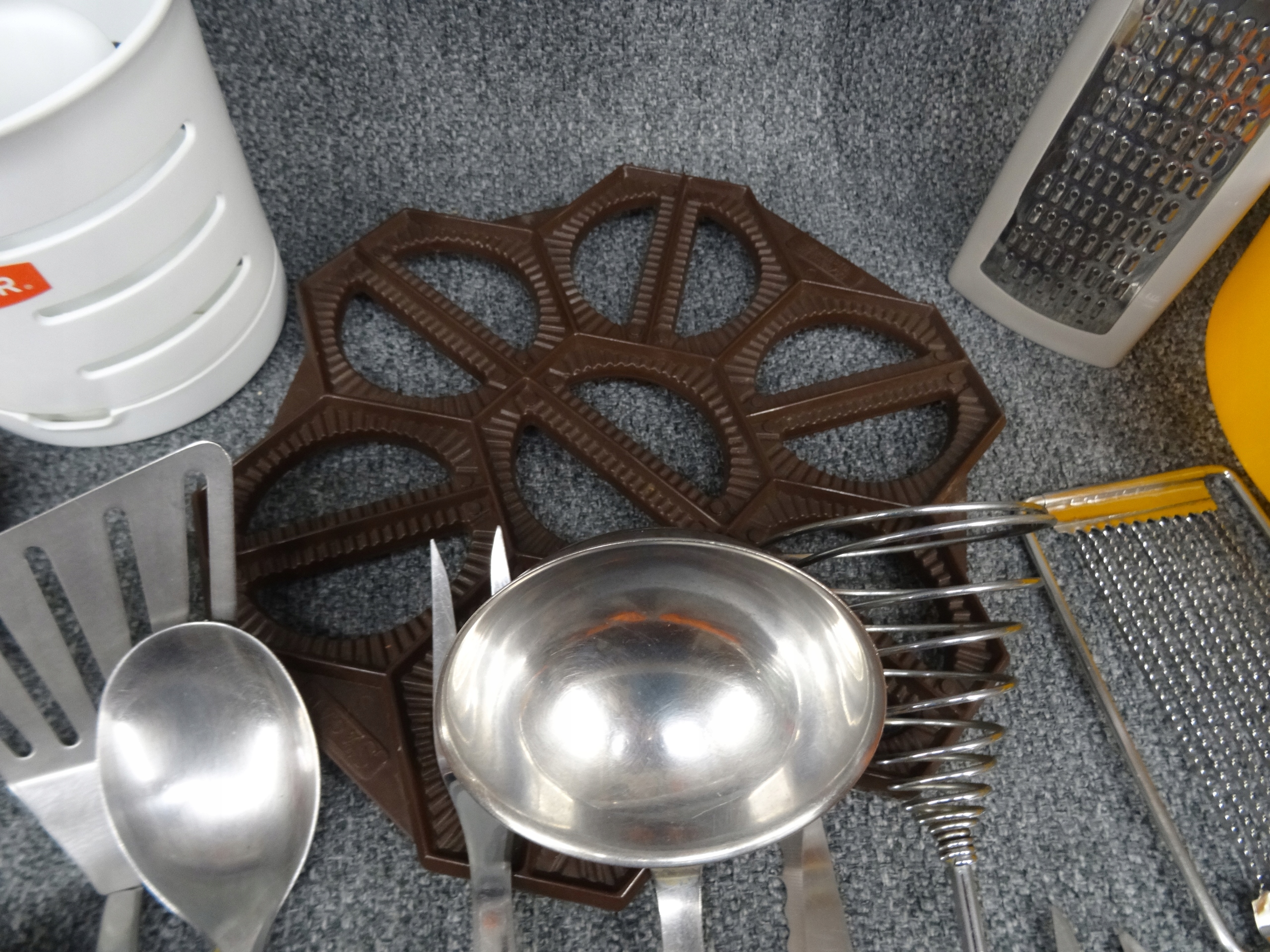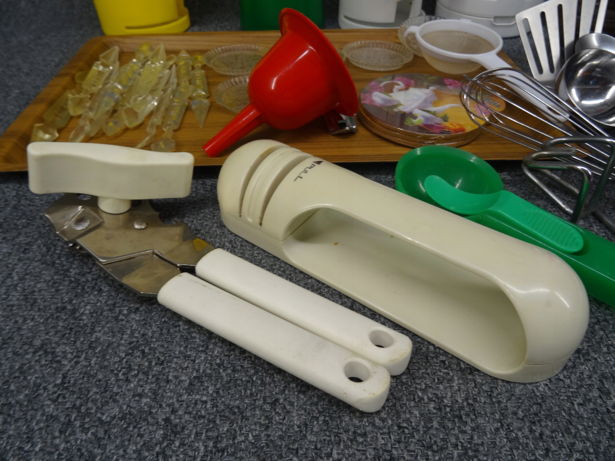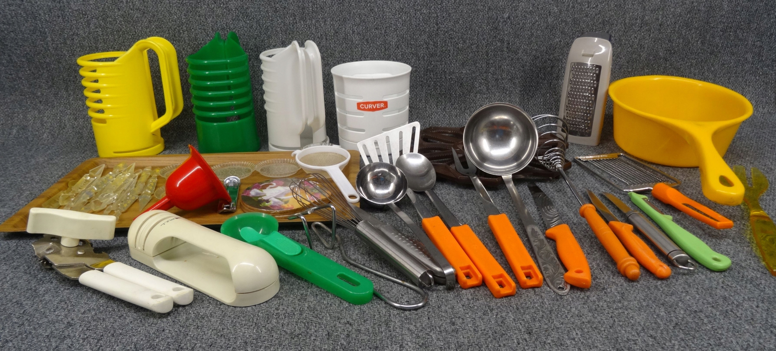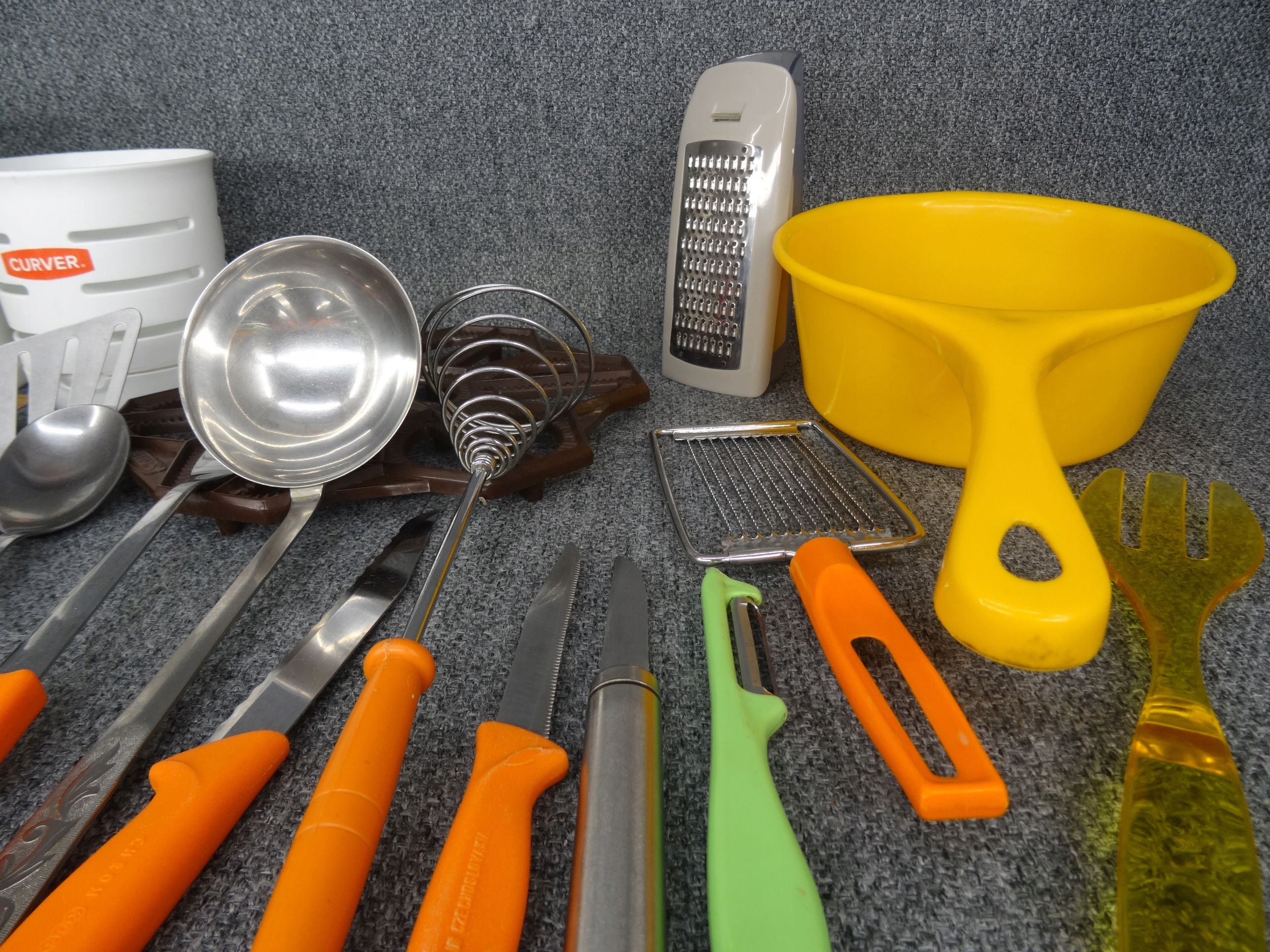 Большой набор различных бытовых приборов: нож, ложка, поднос, консервное открытие, точилка для ножа, кольца, маленькая ситечка, воронка, основание для белья, дренада для искусства, небольшие тарелки, мороженое, ручки для бутылок, например. Для масла, зубочистка. Объекты в основном в очень хорошем и хорошем состоянии с небольшими признаками использования. Состояние, как на фотографиях.