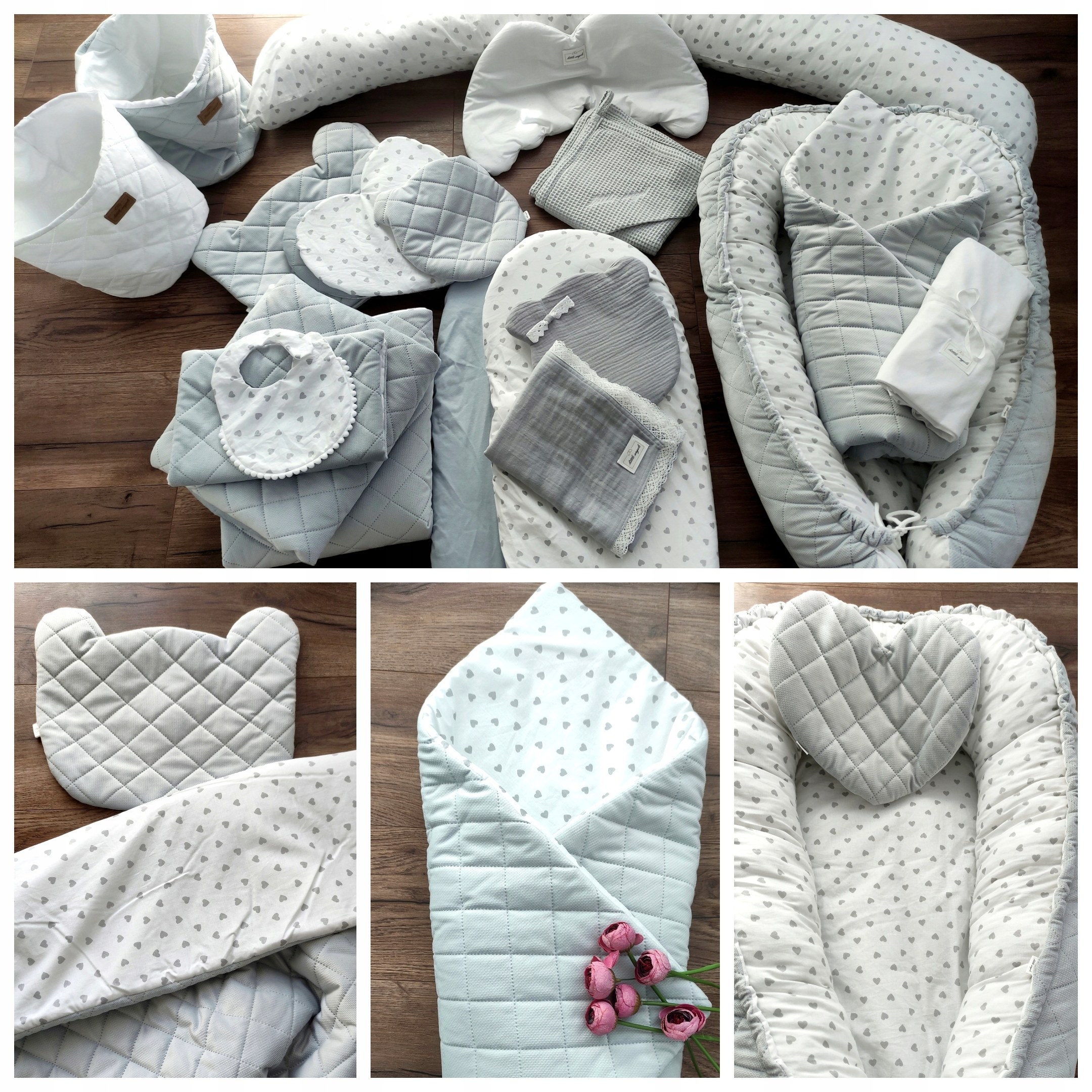 Вы заканчиваете набор Layette? Он не может пропустить этот продукт :) Это одеяло, но с начинкой (анти -аллергической), поэтому его можно использовать не только для дремоты в течение дня, но и в качестве постельных принадлежностей. Он имеет необычный размер - длиной 120 см (обычно 100 x 75 см) и одна сторона из бархата, чтобы он мог быть покрываем в кроватке. Это также будет работать как игровой коврик. Из -за своей длины он будет идеальным в качестве одеяла для коляски. Одеяло с двойным - одна сторона составляет 100 % хлопка с очаровательным рисунком (сердца на белом фоне), другая - бархат (приятно прикоснуться, легко чистить). Вы можете выбрать любую плоскую подушку для другого аукциона (или в форме сердца, плюшевого мишка, крылья, полукругального, прямоугольного). Вы хотите создать гармоничное пространство для своего ребенка? С нами вы завершите уникальный набор Layette.