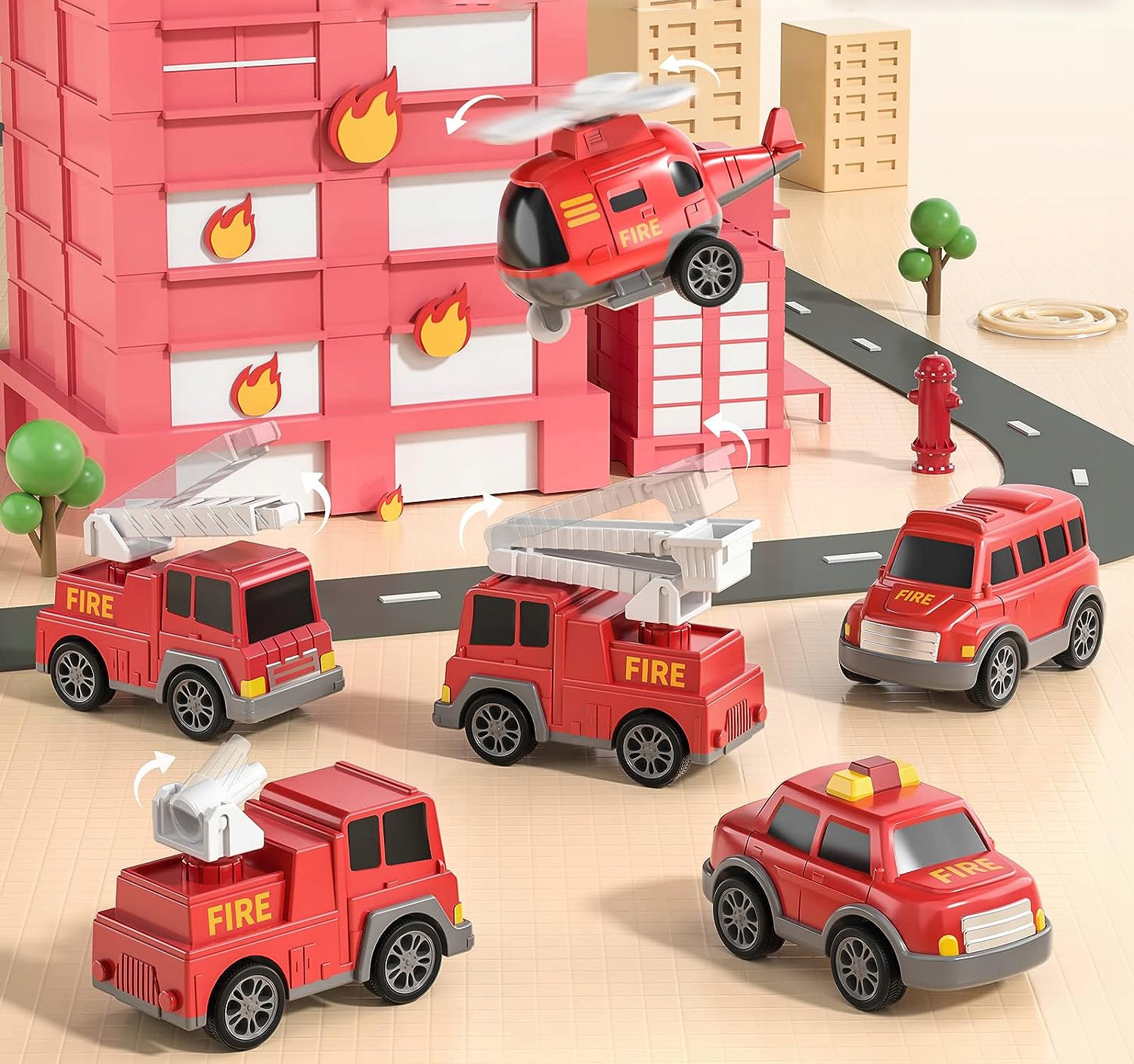 🚒 Предназначен для маленьких энтузиастов пожаротушения, включает в себя большую транспортную машину и 6 небольших автомобилей (пожарная машина, автолестница, вертолет, поливочная машина, легковой автомобиль и внедорожник). ).