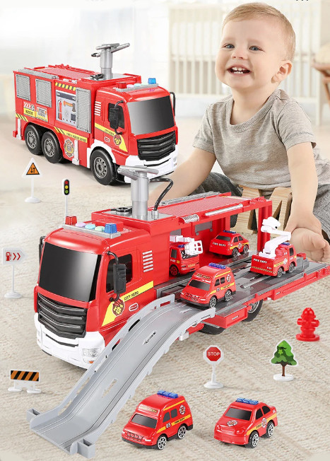 ☑ Пожарная машина с водяным насосом - просто налейте в резервуар для воды, и дети смогут погасить изобретенные пожары с настоящей пожарной мотой, расположенной на крыше p> ☑ Слайд, автомобильная пусковая установка и подъездная дорога сгиба - Динамическое веселье гарантированно! Автомобили скользит по слайду и начинают с пусковой установки, готовые к спасению. Это простое решение делает веселье еще более захватывающим. Полем Маленькие транспортные средства идеально вписываются в большую пожарную машину