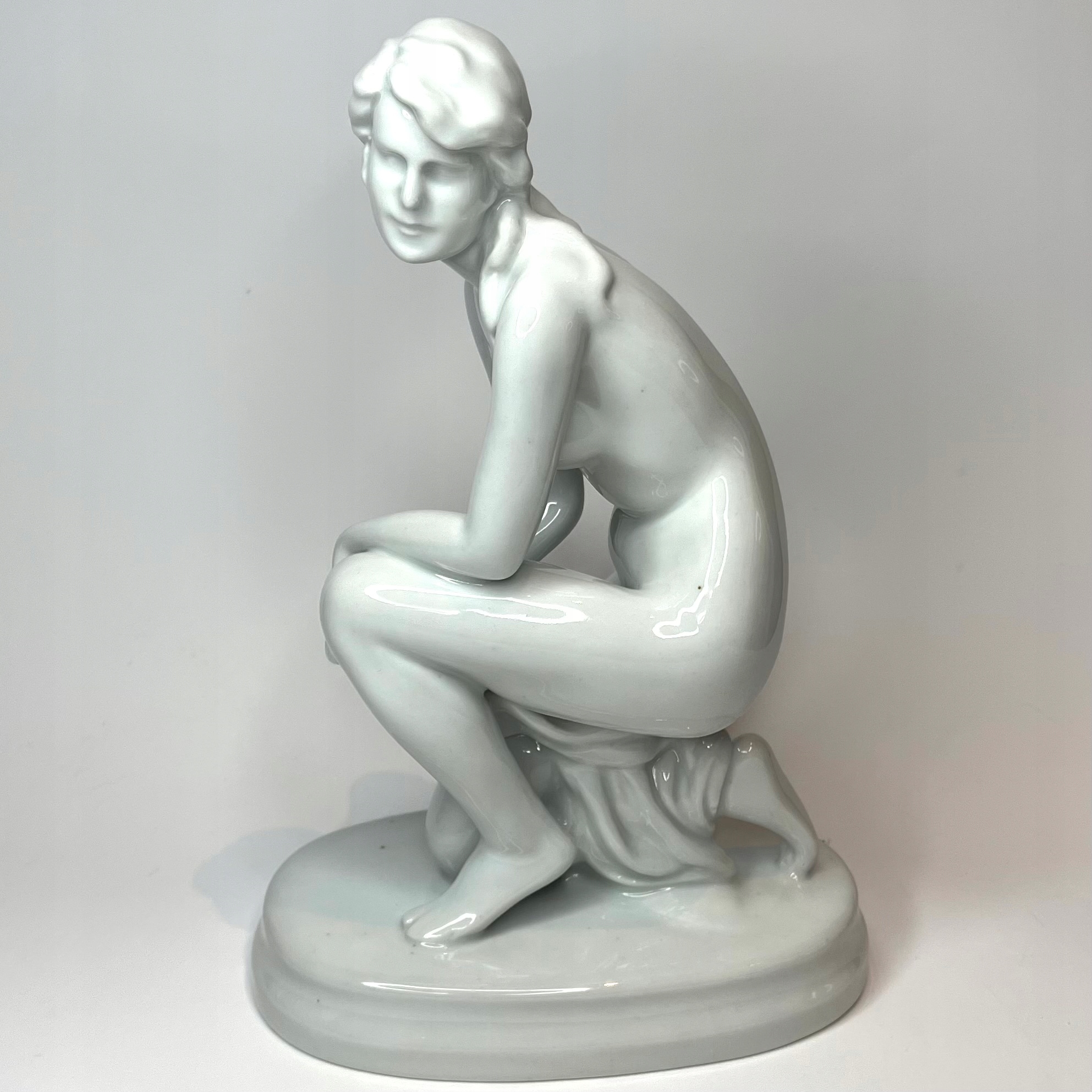 Элегантная, большая фарфоровая статуэтка, изображающая обнаженную женщину, произведена на известной венгерской мануфактуре Zsolnay. Статуэтка из белого фарфора идеальна для интерьера в классическом стиле. Элегантная поза и изящная лепка делают ее привлекательным украшением.