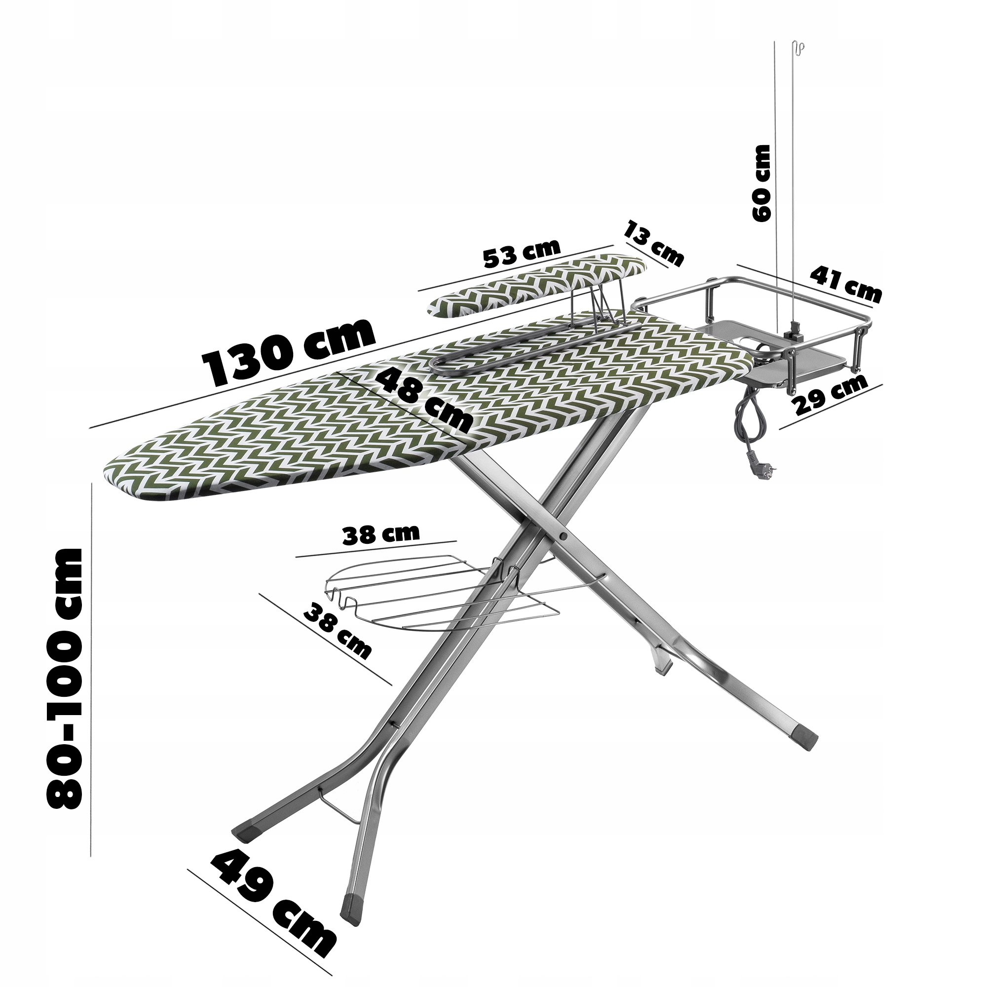 Предлагаемое оборудование оснащено дополнительными элементами, позволяющими быстро и эффективно гладить. В комплект с доской входят, среди прочего: чехол, полка для одежды, практичная подставка для утюга и паровая станция, а также розетка! Один продукт, столько функций, необходимых для комфортного глажения! Узнайте, почему стоит приобрести нашу функциональную доску!