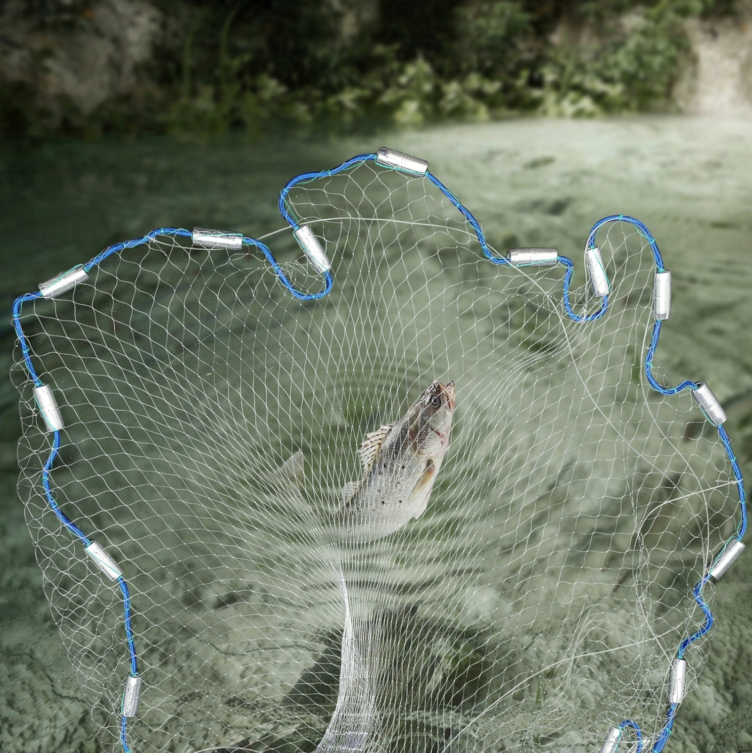 - Быстро тонет: Тяжелые стальные грузики, равномерно распределенные по периметру, позволяют сети быстро опуститься на дно, прежде чем рыба сможет выбраться.
