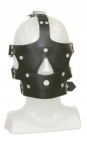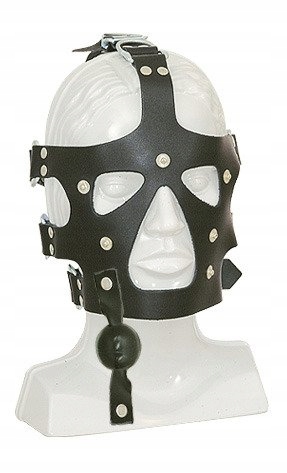 Большая кожаная маска, закрывающая всю голову, со съемными наглазниками (слепая любовь), кляпом и обтянутым кожаным чехлом.