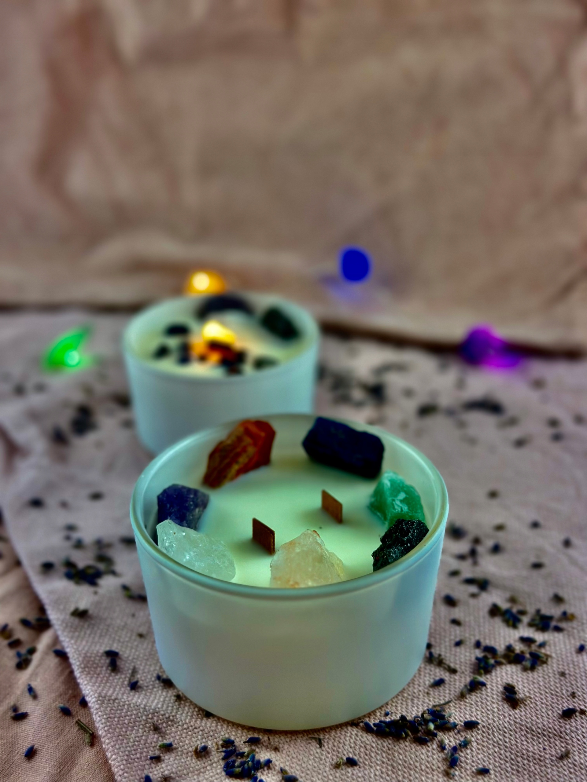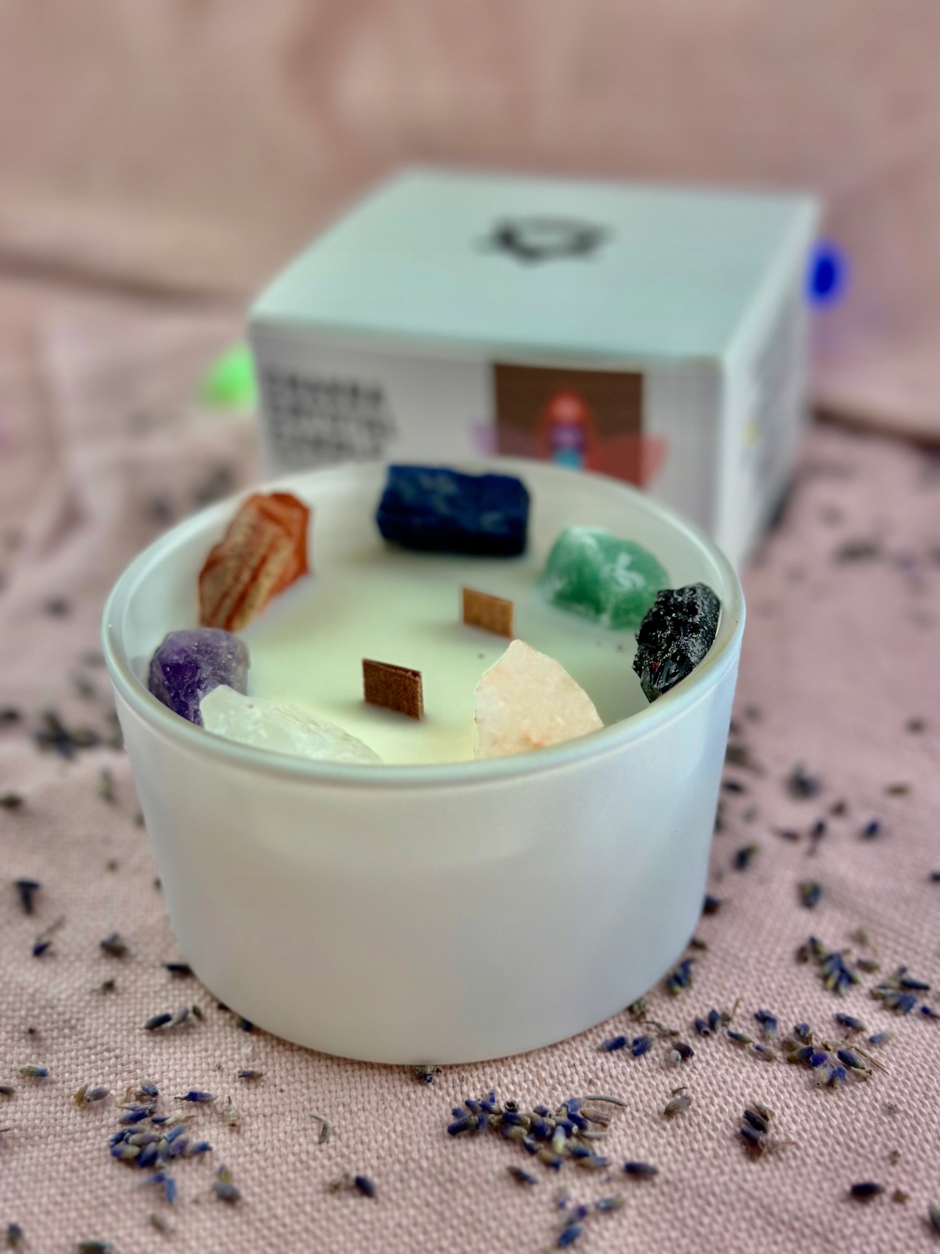Гармоничное сочетание камней натуральных и ароматов, резонирующих со всеми семью чакрами. Эта свеча представляет собой симфонию энергии и баланса.