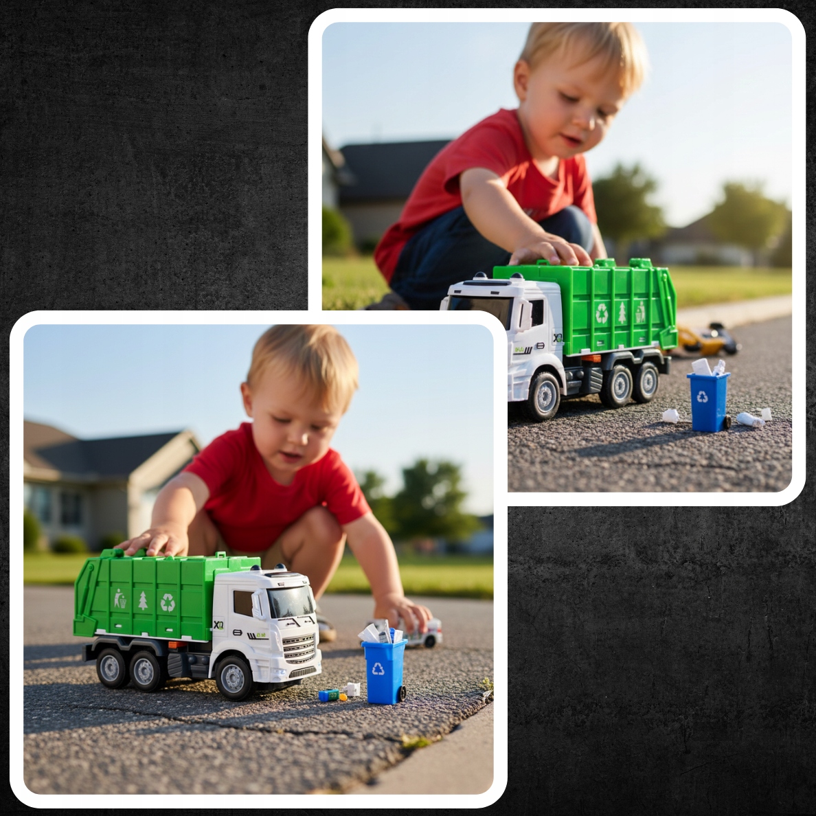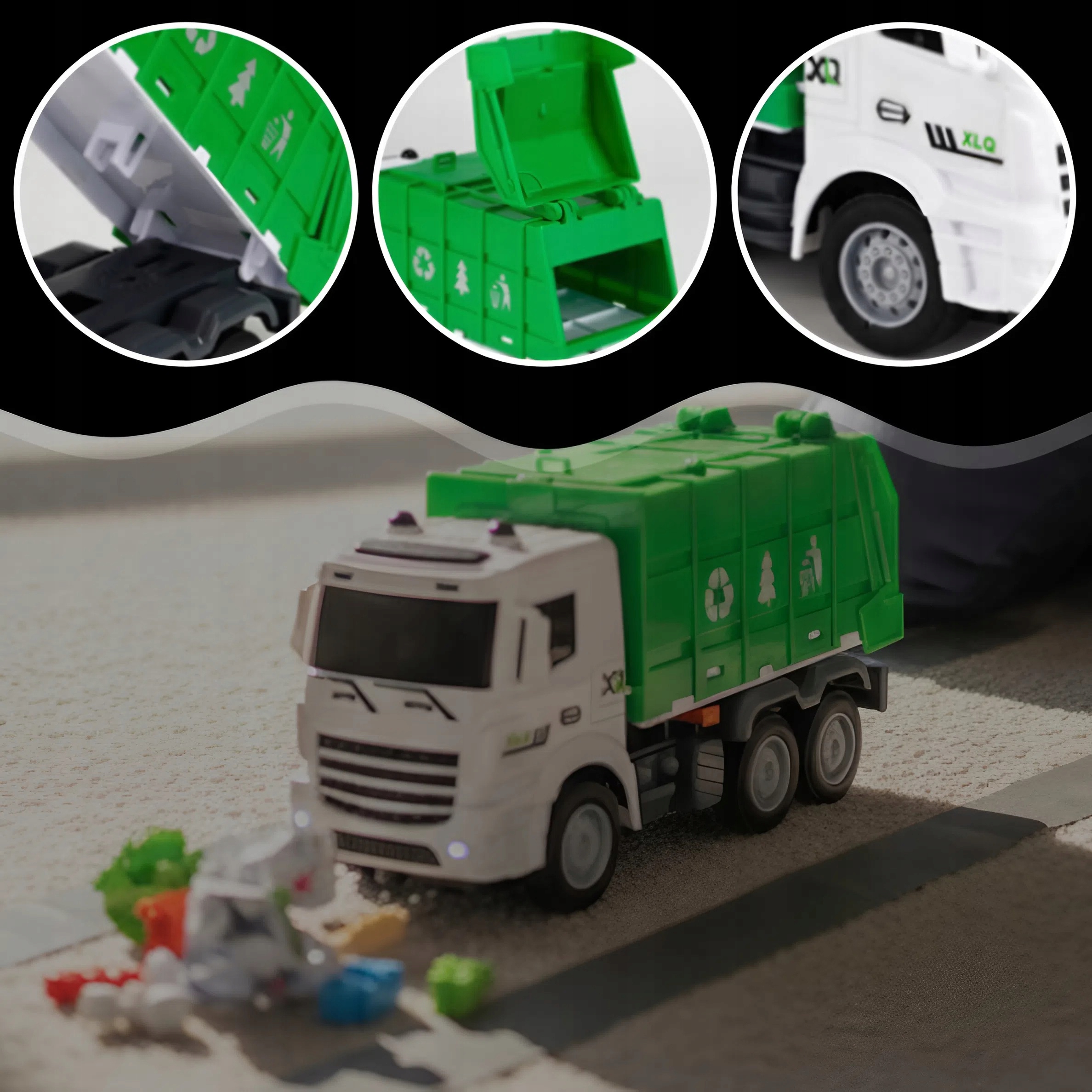 ➡️ ПОДЪЕМ САМОСВАЛА И ОТКРЫТИЕ КРАНА — задняя часть автомобиля открывается и поднимается, что позволяет имитировать выгрузку мусора. Благодаря этому веселье становится еще более реалистичным!