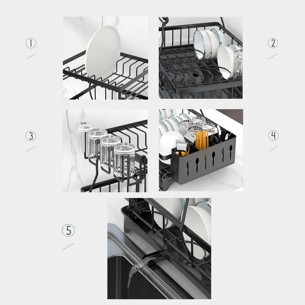 ✔️【Двухъярусный, очень большая вместимость】 Размеры: 41,5 см (длина) x 30 см (ширина) x 34 см (высота) см, двухъярусная полка для посуды, больше места для хранения, чем обычный набор для сушки и сушки посуды. Держите кухню в чистоте и порядке. Обе стороны стойки для сушки посуды предназначены для размещения большего количества кухонной утвари и поставляются с дополнительными, свободно подключаемыми аксессуарами, в том числе подставками для посуды и подстаканниками.