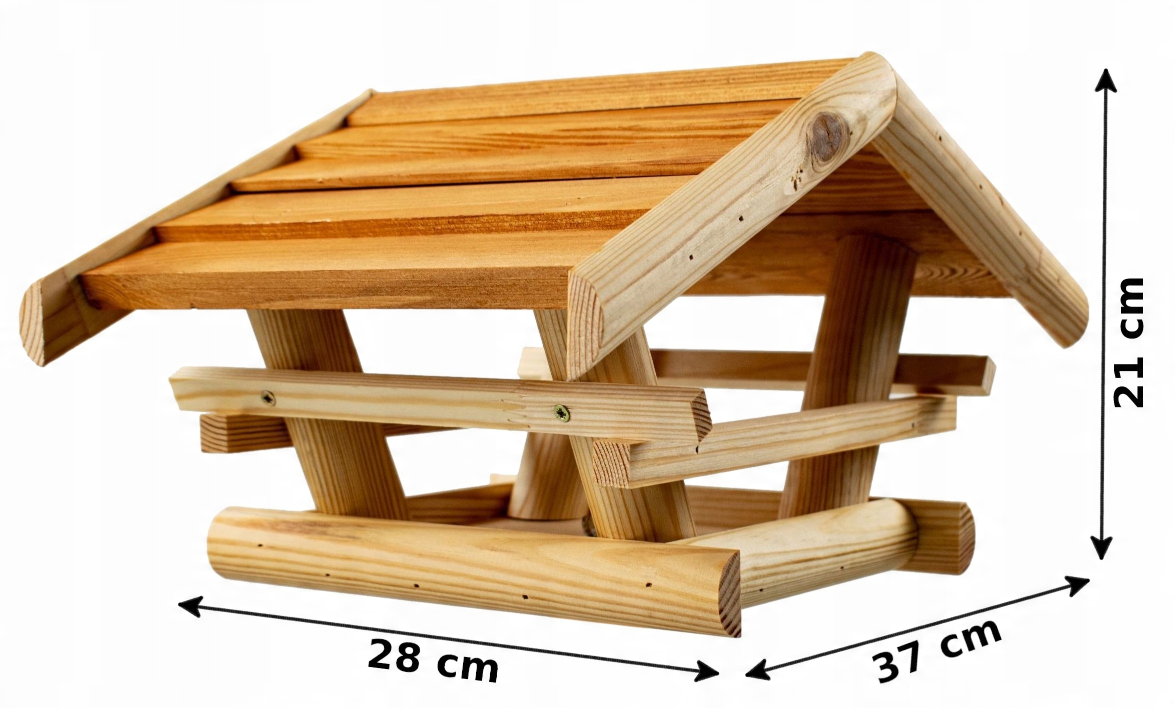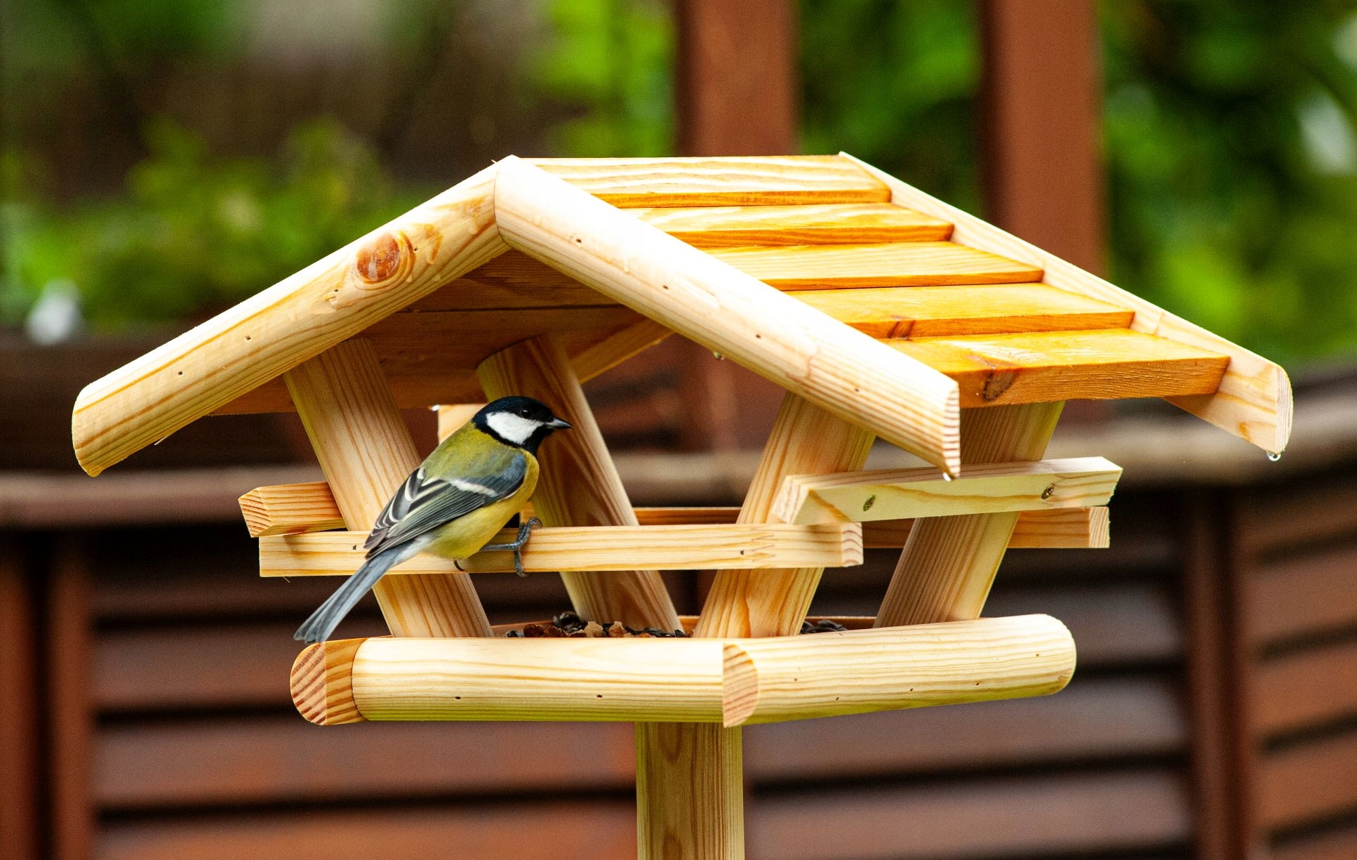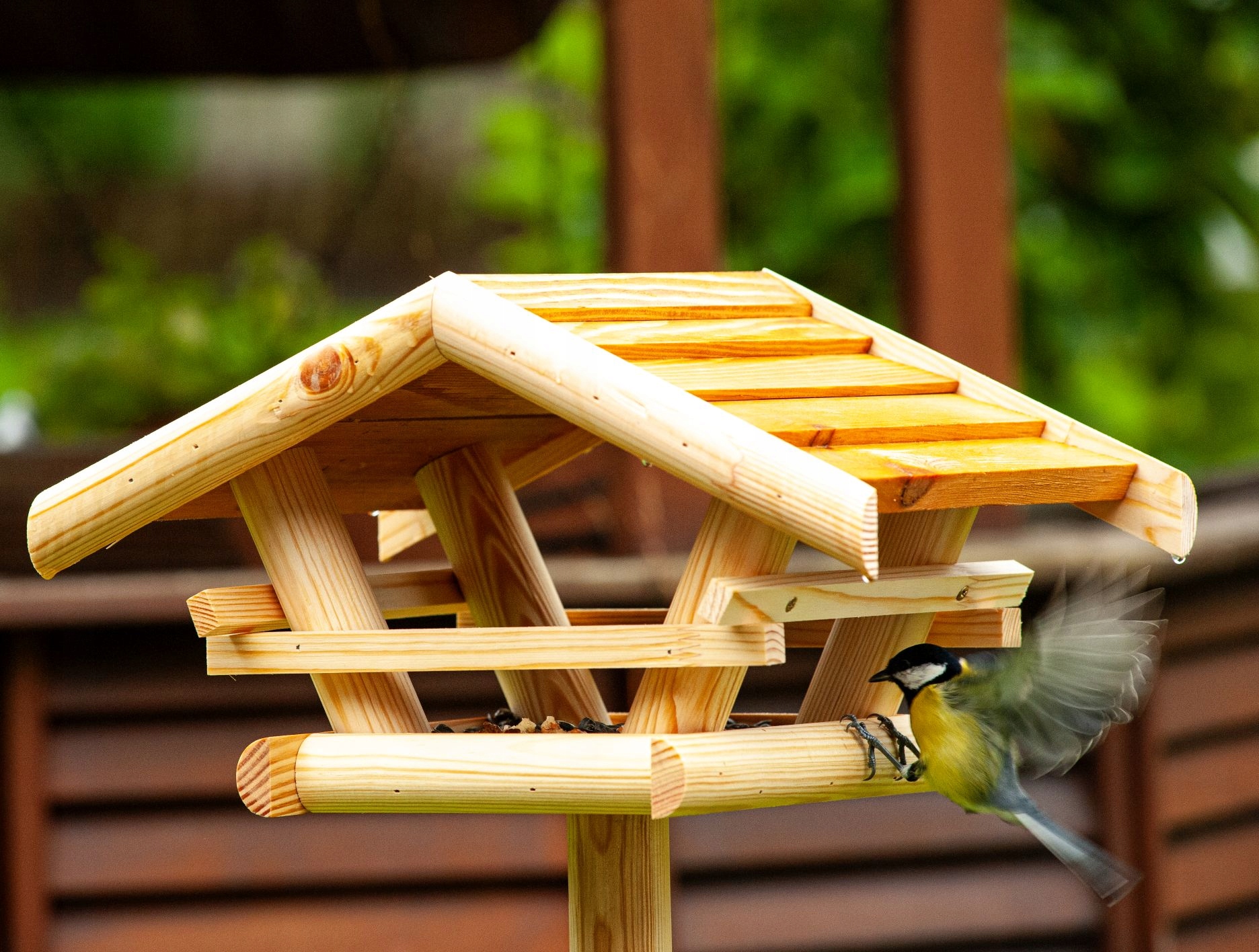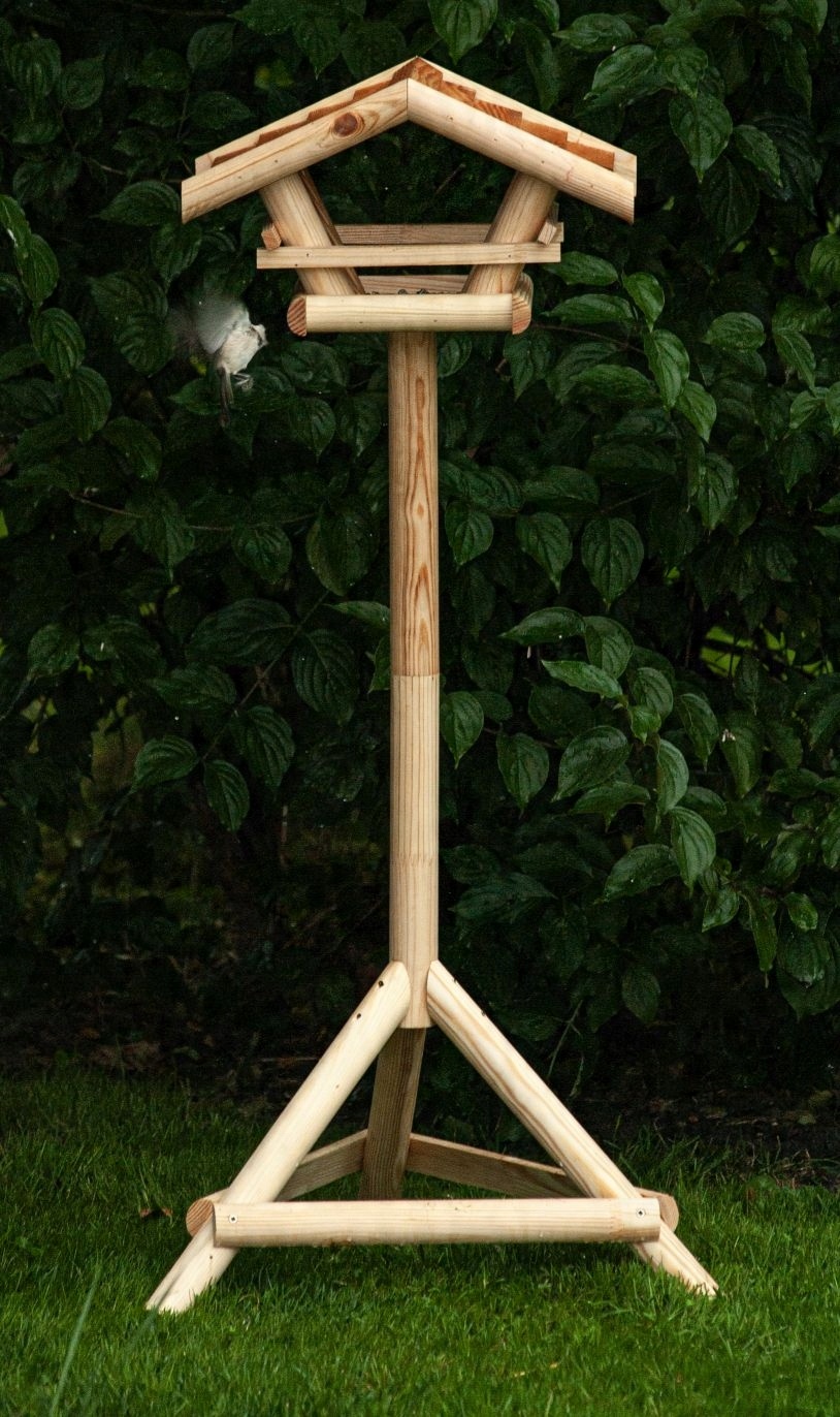 Большая кормушка для птиц с янтарной деревянной крышей прекрасно впишется в естественный образ любого сада.