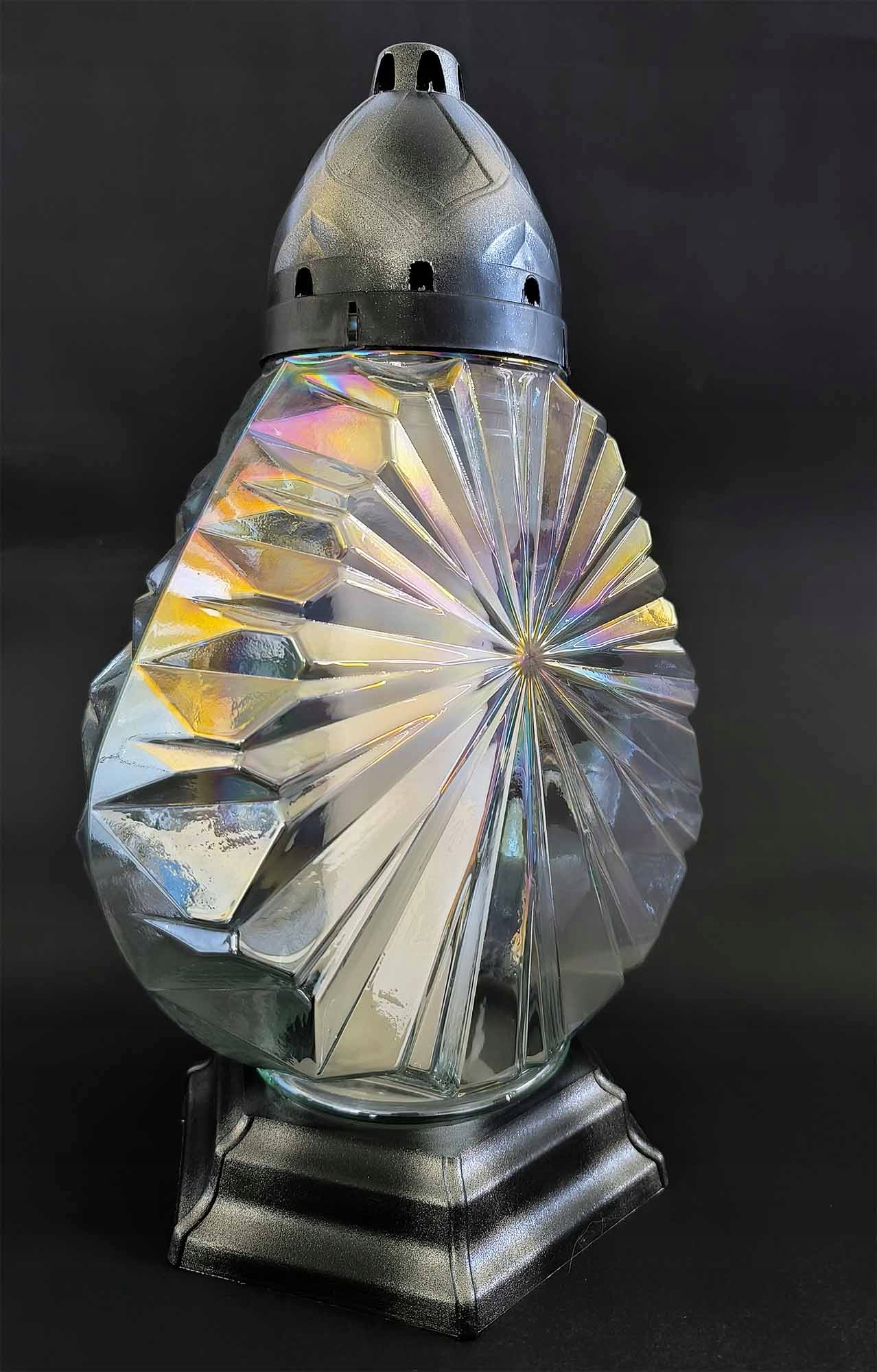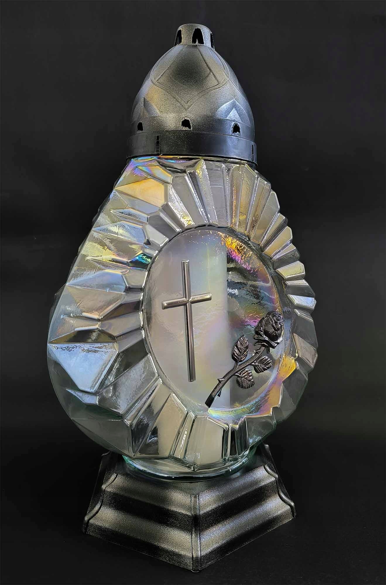Красивая стеклянная свеча (эффект радуги), сделанная в серьезном стиле с серебряным крестом и эмблемой розы. Все элементы идеально сочетаются друг с другом, они сделаны точно и эстетически.