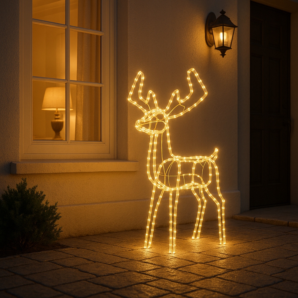 Уникальное рождественское украшение в виде большого светодиодного оленя, ок. Высота 95 см, что привлекает внимание как днем, так и в темное время суток. Благодаря эффектному освещению и движению головы в сторону олень выглядит чрезвычайно реалистично и добавляет волшебства праздника в окружающее пространство.