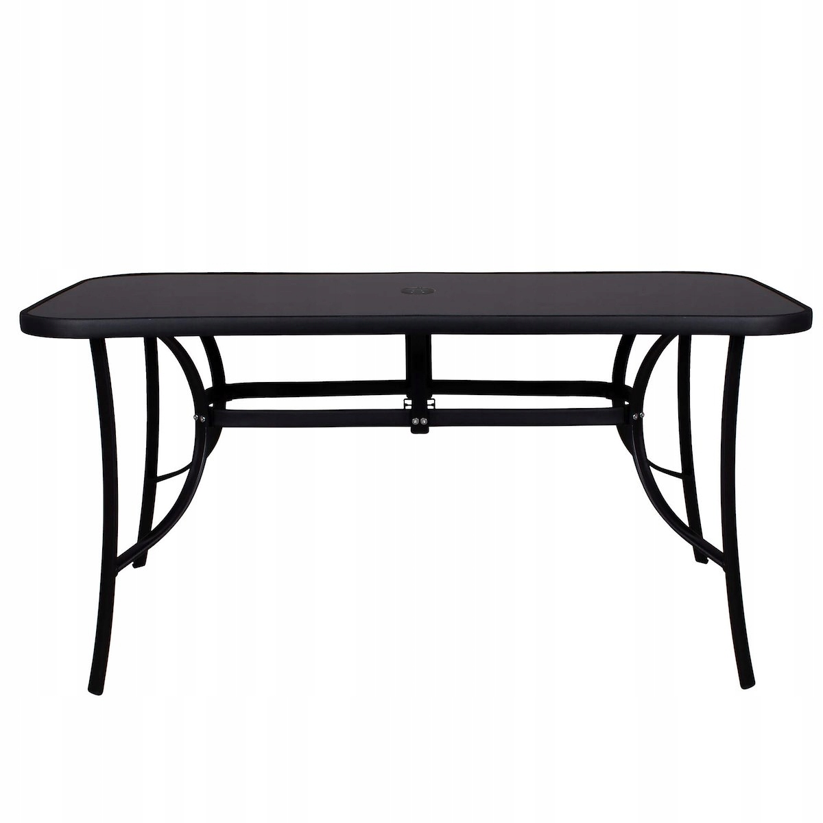 В центральной точке стола имеется закупоренное отверстие для зонта, законченное с внутренней стороны ободком, обеспечивающим дополнительную защиту стекла и предотвращает его повреждение. Столешница изготовлена из прочного закаленного стекла, ее легко содержать в чистоте. Высокое качество изготовления делает ее устойчивой к различным неблагоприятным погодным условиям.