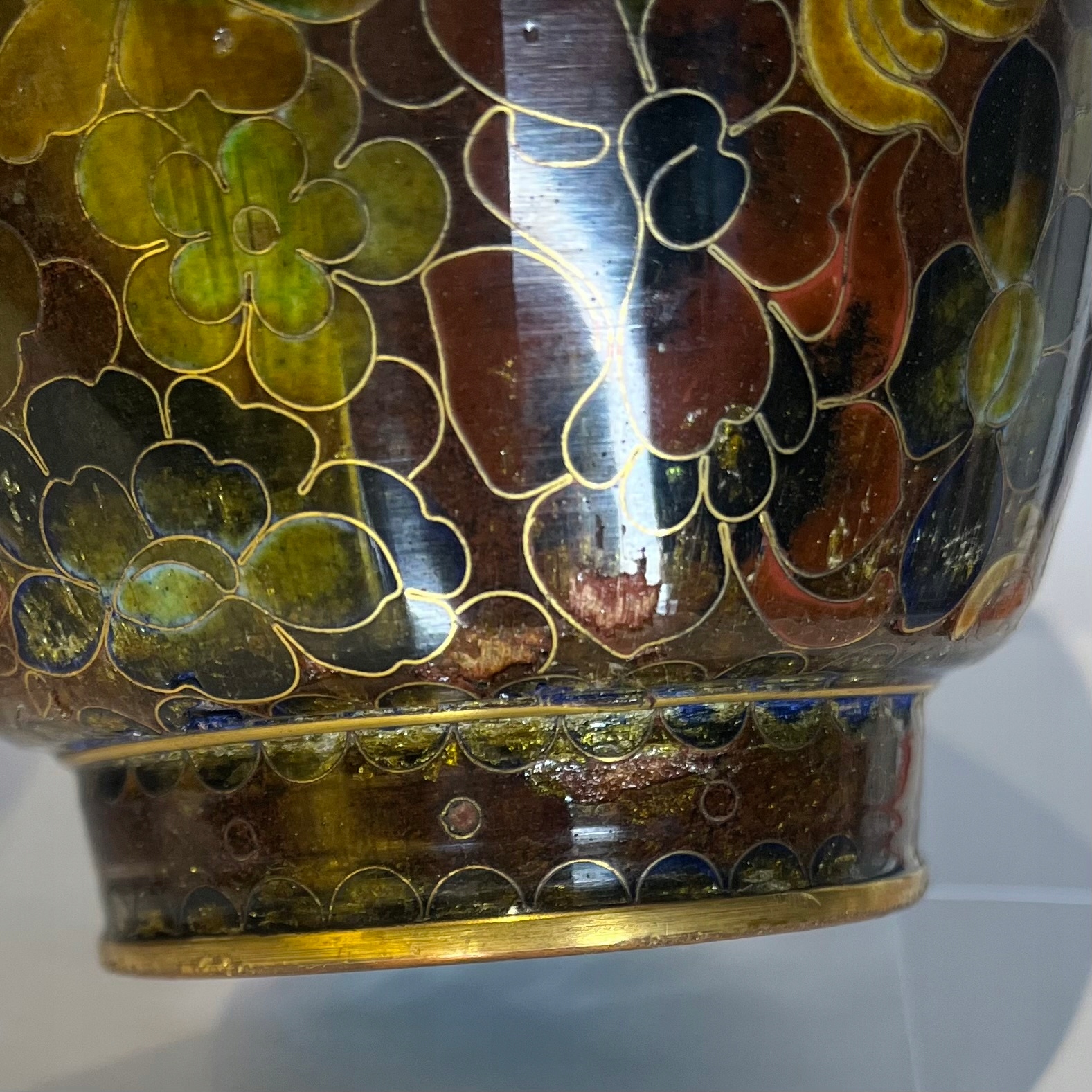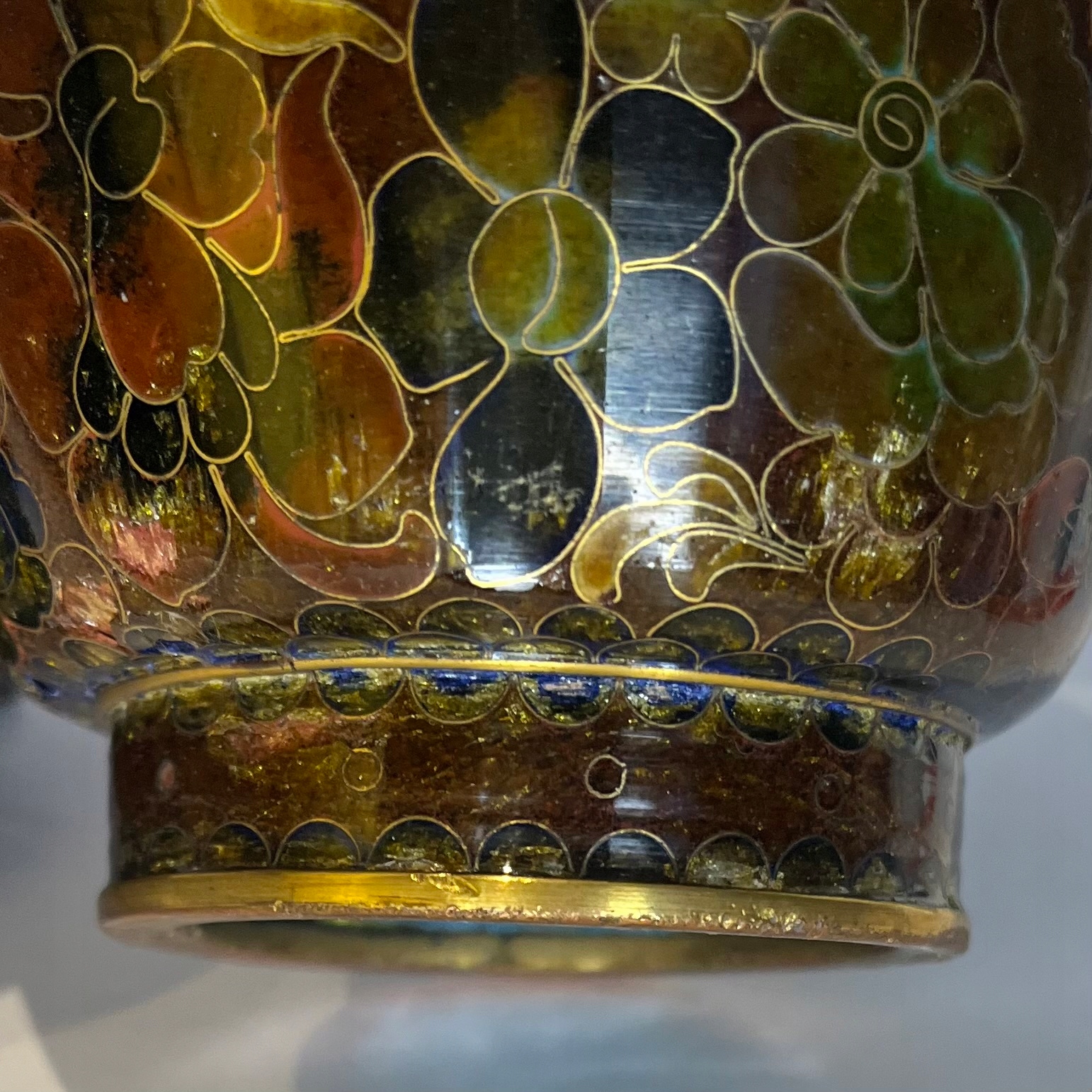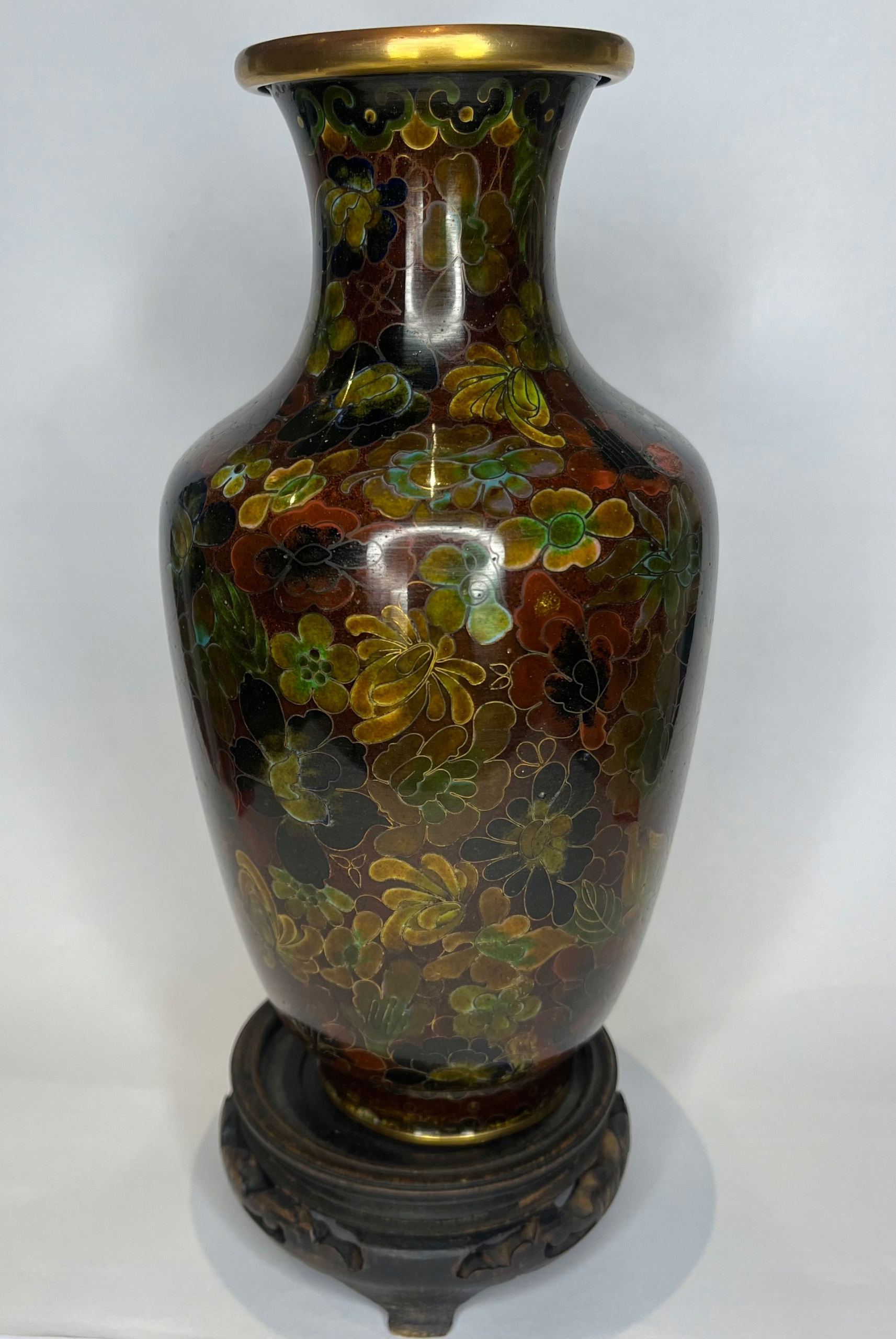 Большая ваза Cloisonné (клеточная эмаль) с основанием, дефектами эмали, 25 см