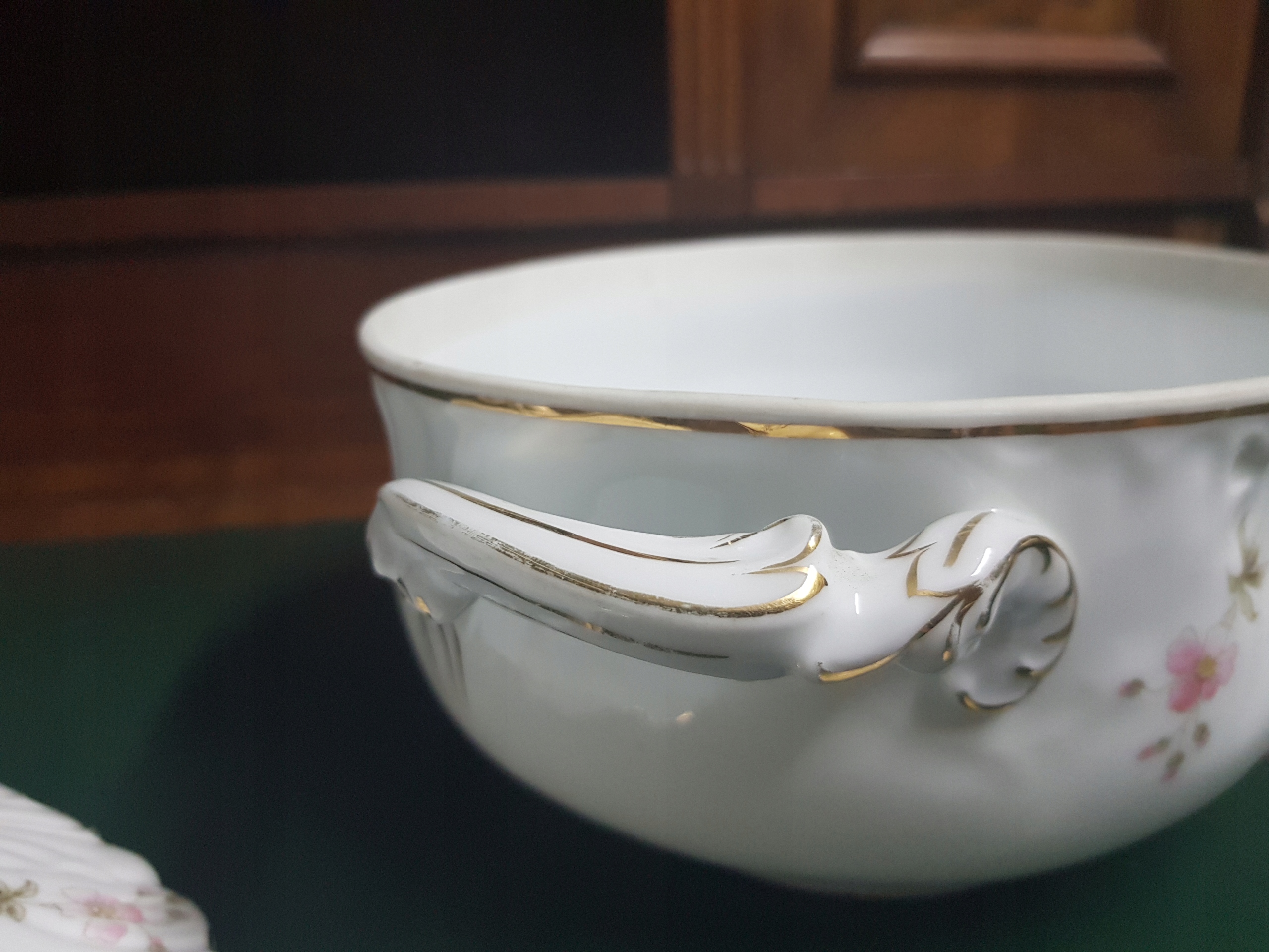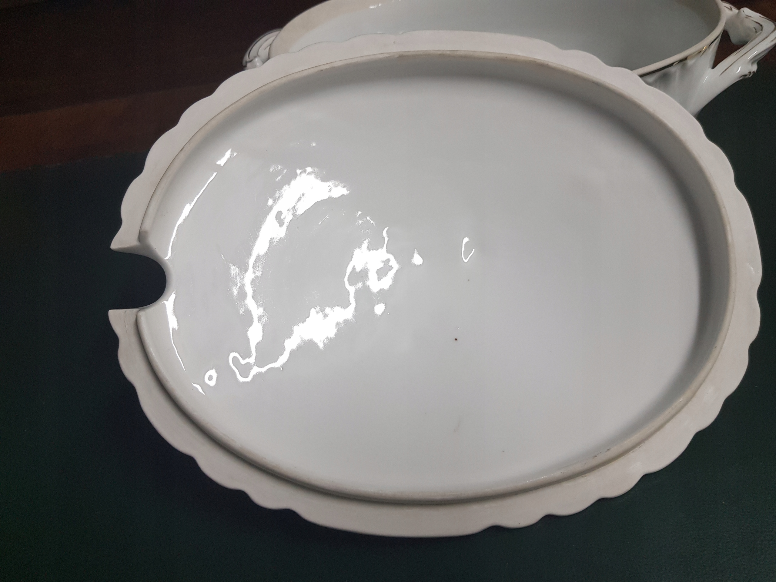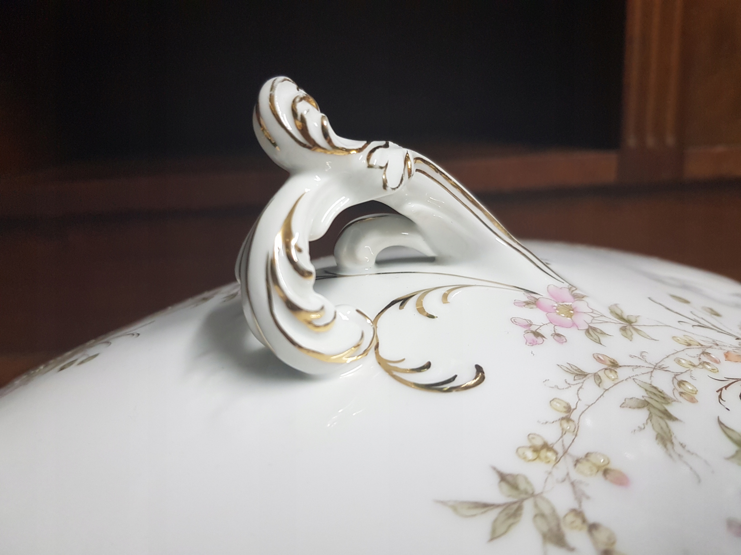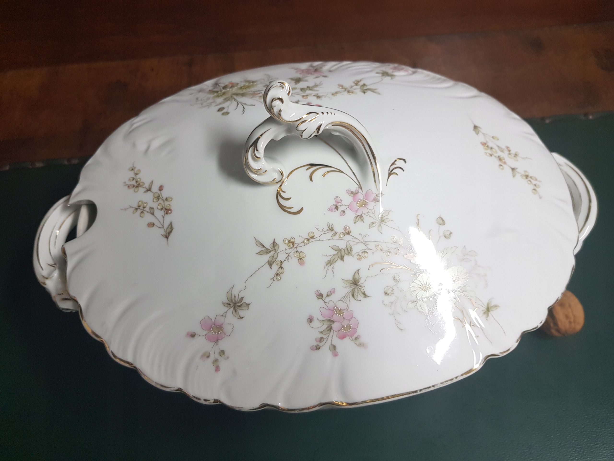 Предмет аукциона – ваза для супа в стиле модерн, украшенная растительным мотивом. Тиснение по позолоте по краю крышки.