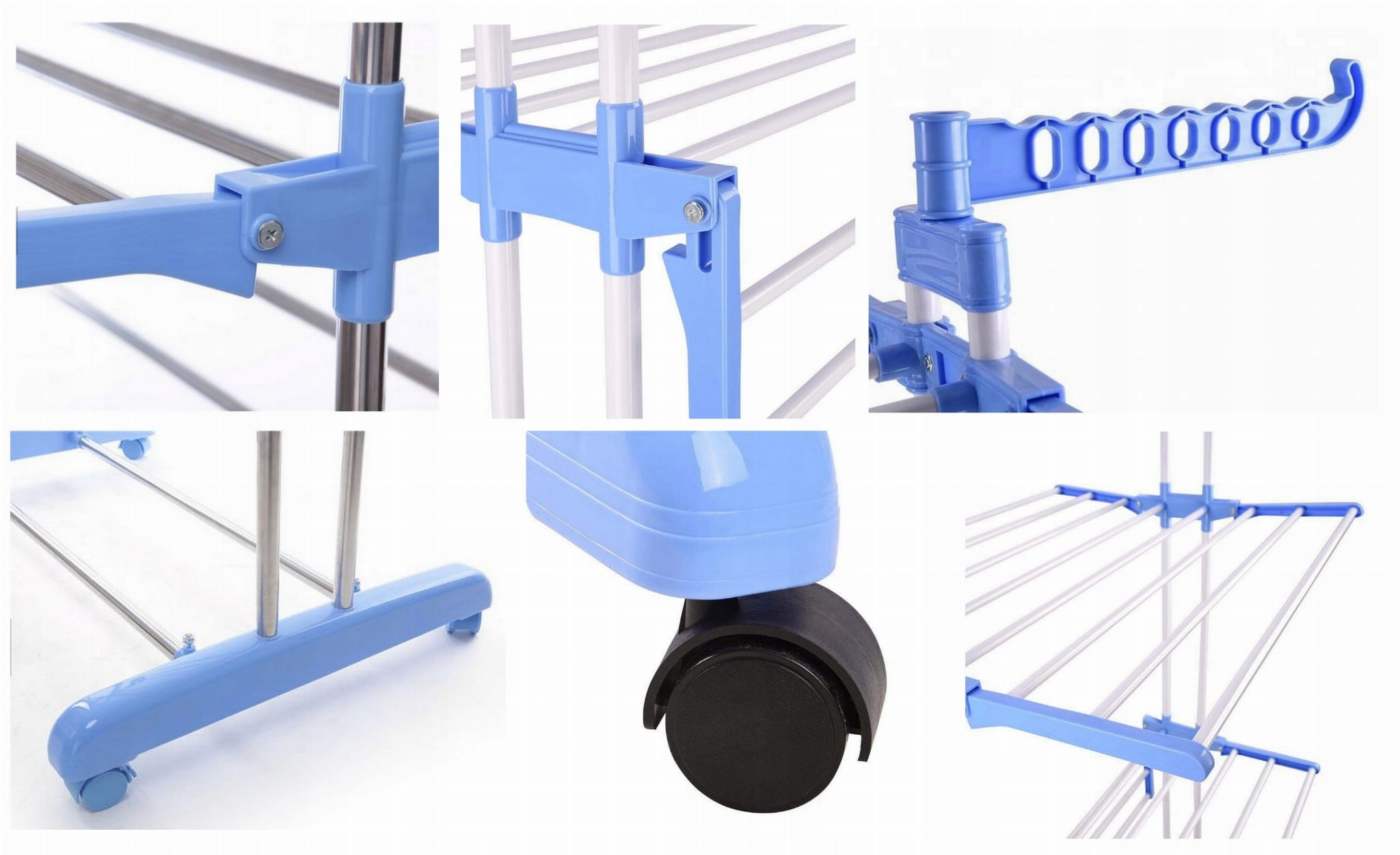 Сушилка изготовлена из высококачественных материалов. Она оснащена колесиками, благодаря которым перемещение белья легко и не требует особых усилий. В зависимости от ваших потребностей колеса можно снять, что не влияет на устойчивость сушилки. Она занимает гораздо меньше места, чем традиционные сушилки. Вертикальная конструкция позволяет размещать его на небольших поверхностях, например, в душевой поддоне.