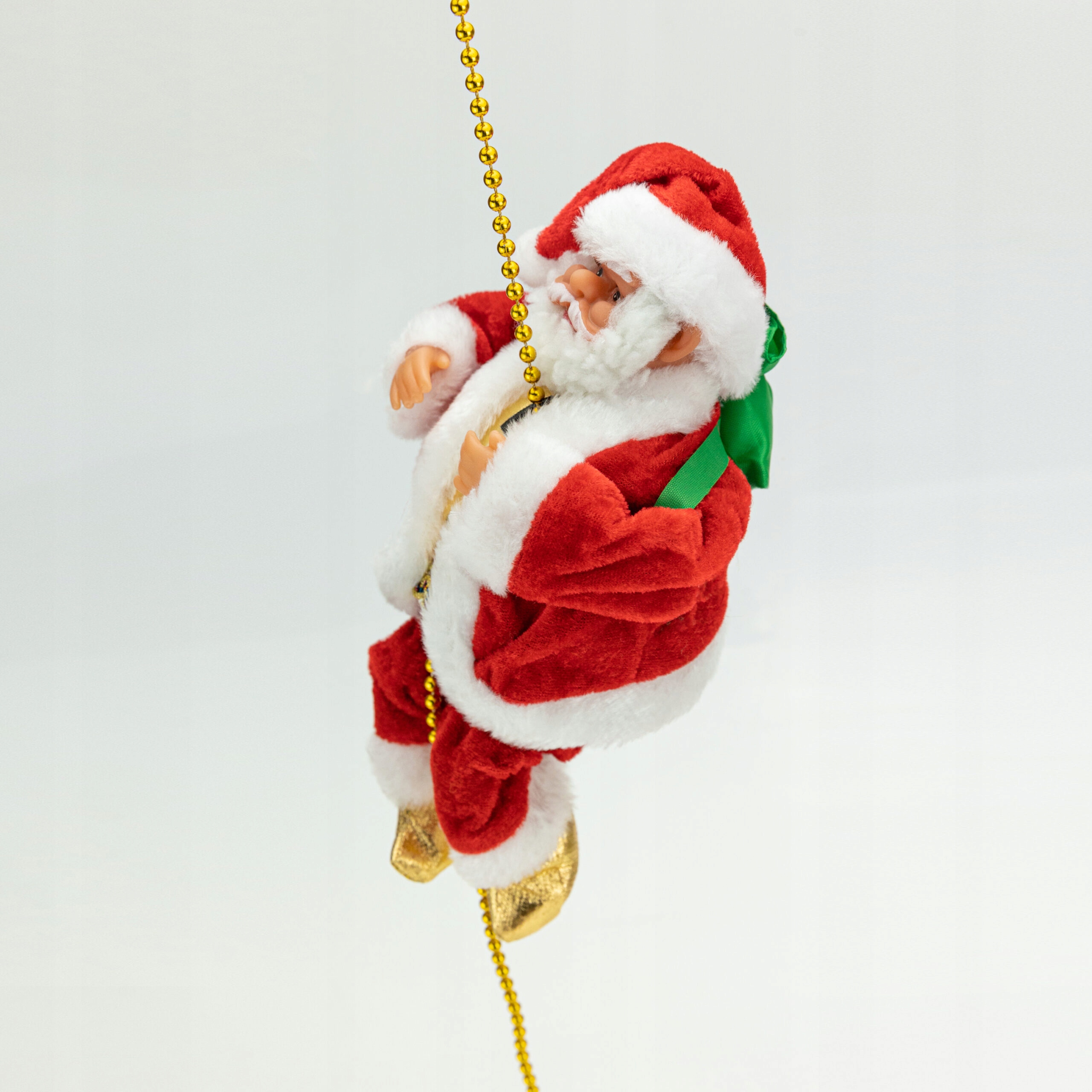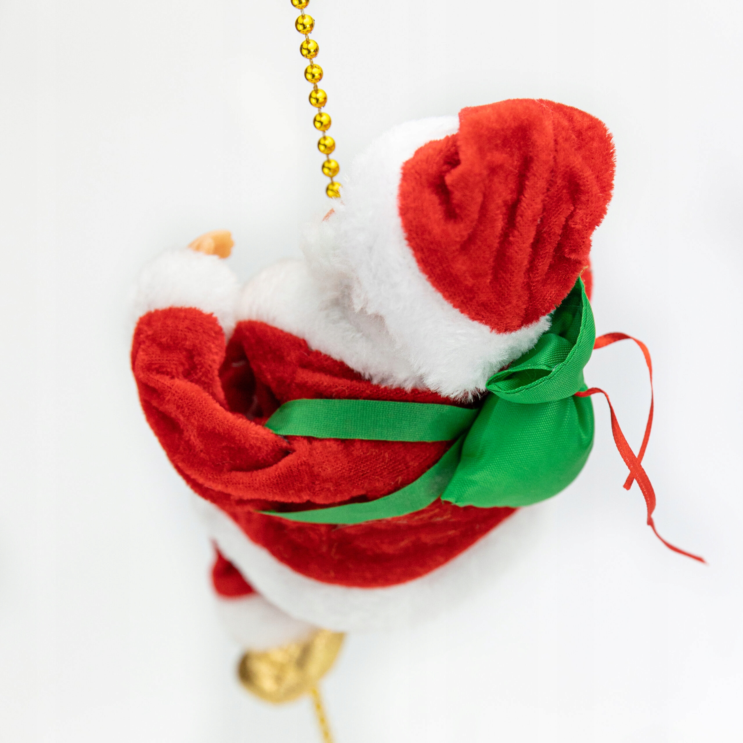 Питается от 3 батареек АА (не входят в комплект). Бусы длиной 100 см, Санта передвигается по ним то вверх, то вниз. Бусы с одной стороны заканчиваются крючком, позволяющим повесить их в подходящем месте, а с другой - золотым колокольчиком.