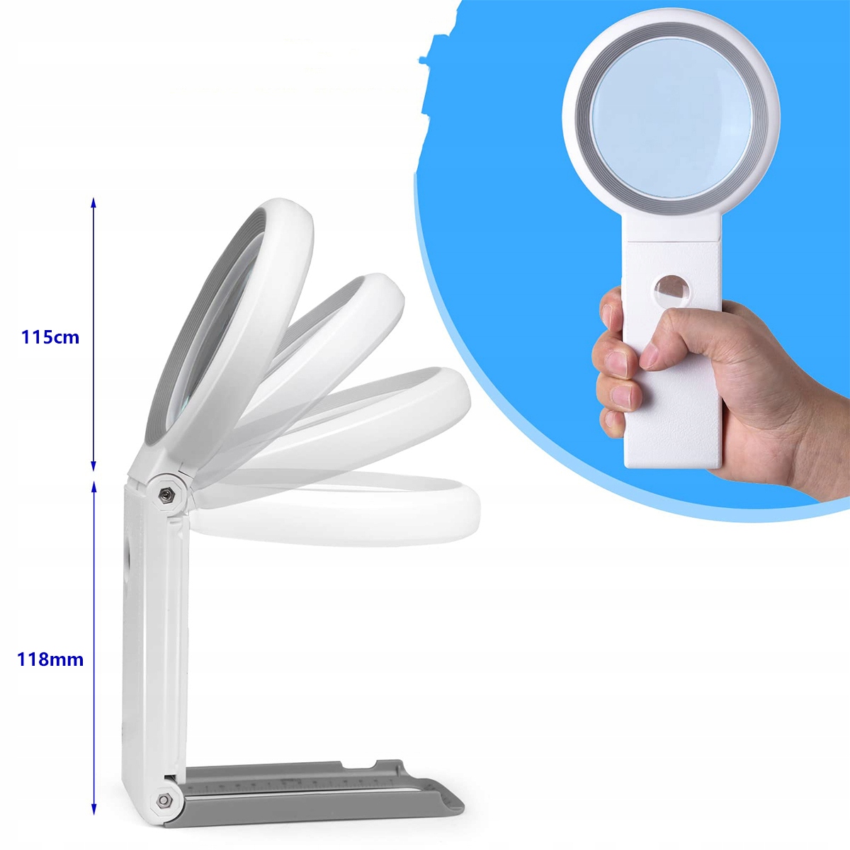 ☑ Стенд с укладками: увеличивается рука, что позволяет ей помещать ее на стол и отпустить руку, делая чтение более удобным. Вы также можете адаптировать угол к вашим потребностям. База имеет измерительную шкалу, которая позволяет измерять мелкие предметы и делать простые чертежи (точность 0,5 мм и 1/16 дюймов).