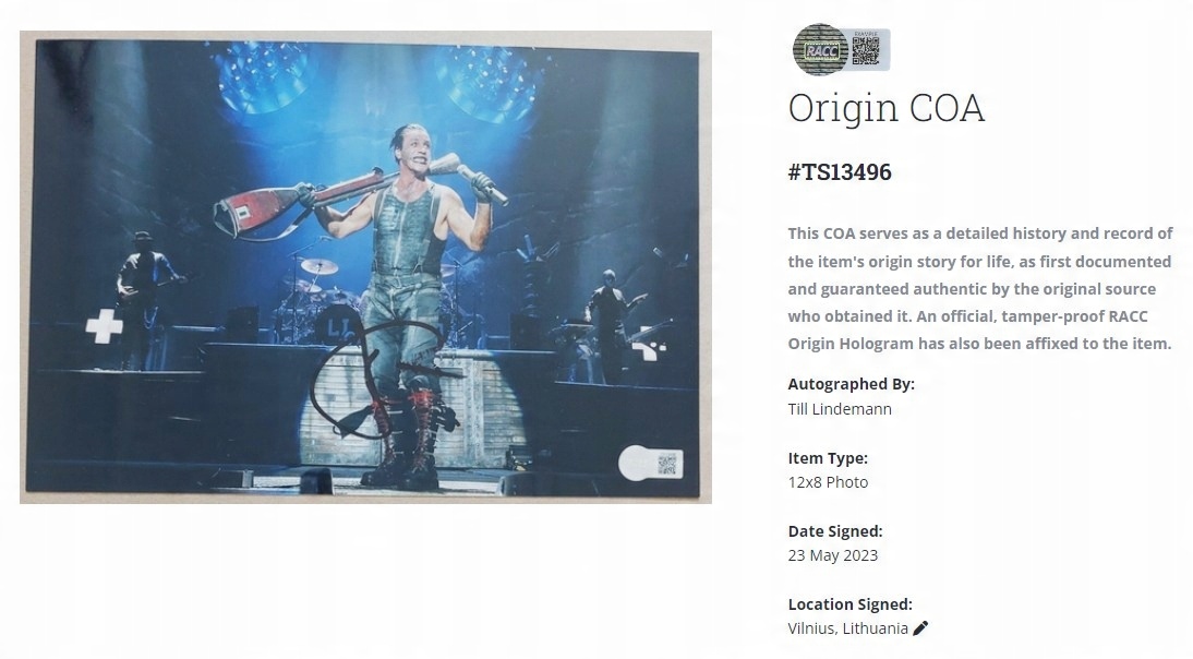 Просматривая «Велике фото RAMMSTEIN TILL LINDEMANN з ОРИГІНАЛОМ АВТОГРАФА + СЕРТИФІКАТ», вы можете быть уверены, что данный товар из каталога «Автографы» будет доставлен из Польши и проверен на целостность. В цене товара, указанной на сайте, учтена доставка из Польши. Внимание!!! Товары для Евросоюза, согласно законодательству стран Евросоюза, могут отличаться упаковкой или наполнением.