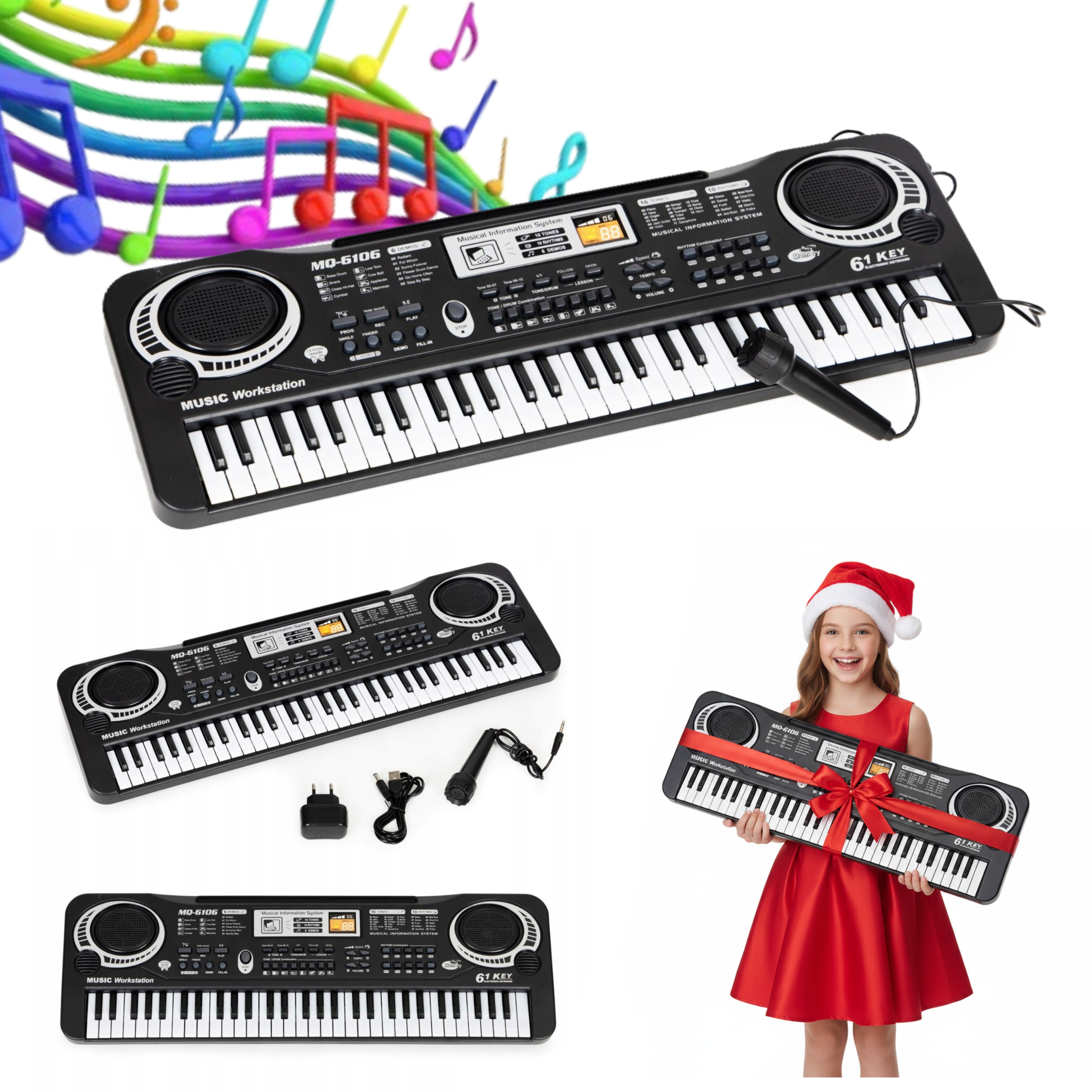 БОЛЬШОЕ ПИАНО ДЛЯ ДЕТЕЙ, КЛАВИАТУРА, МИКРОФОН, 61 КЛЮЧ, В ПОДАРОК + БЛОК ПИТАНИЯ