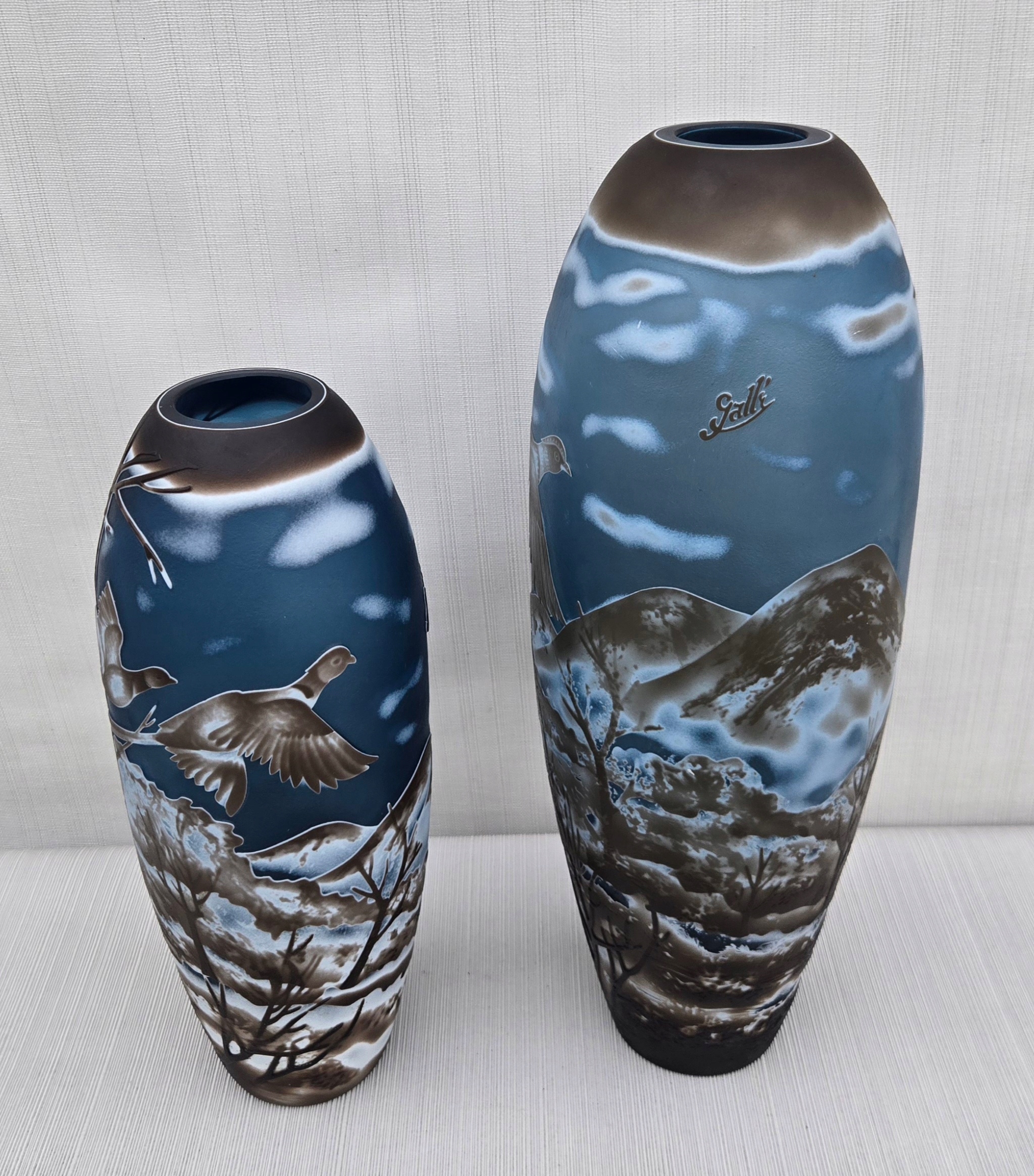 Этот уникальный объект изготовлен из высококачественного стекла, а его поверхность украшена сложной гравированной сценой, изображающей птиц в полете на фоне ландшафта.